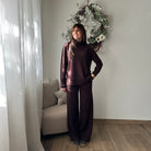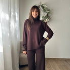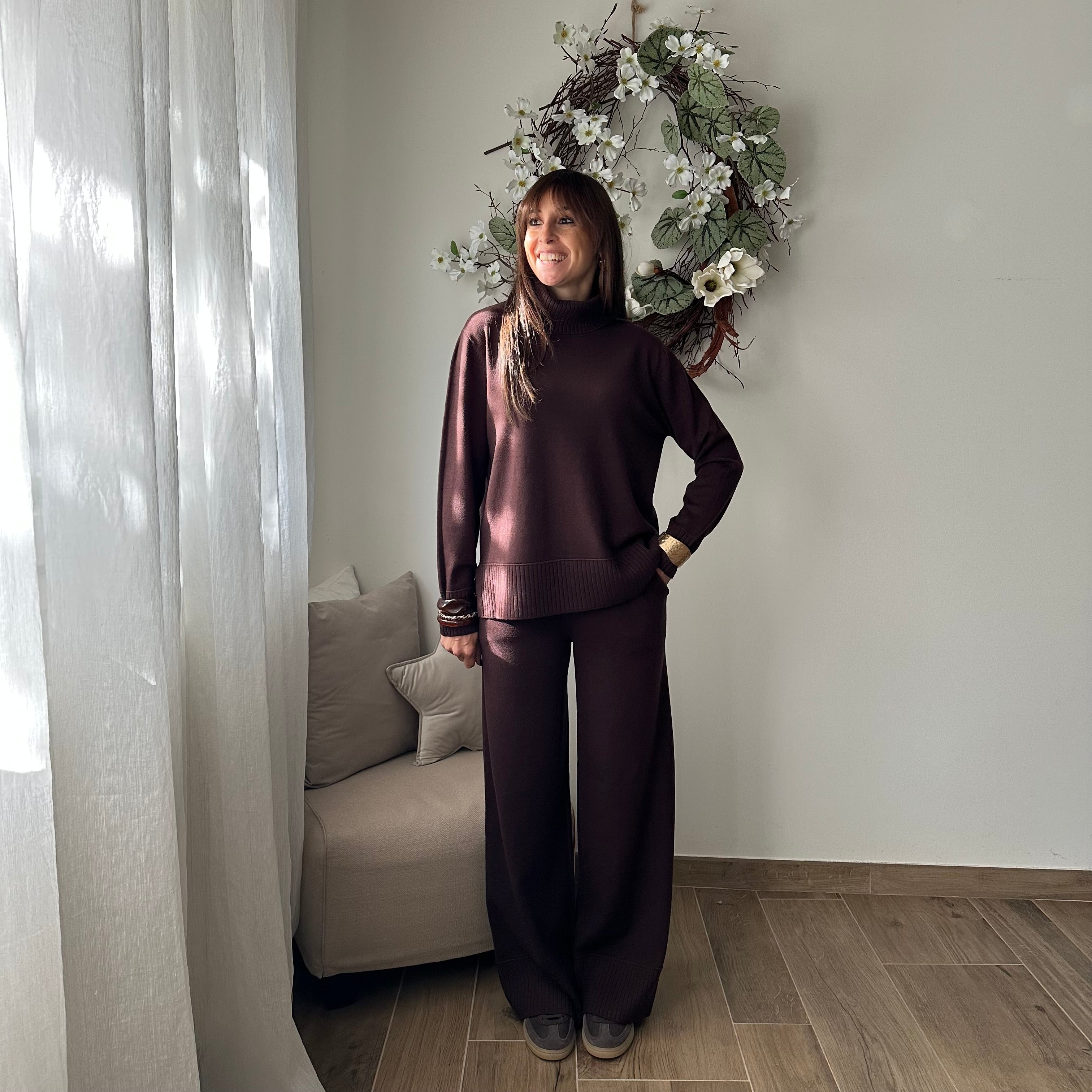 Completo composto da maglione con collo alto e pantalone palazzo con elastico in vita