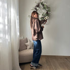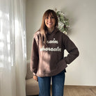 Felpa marrone con scritta ricamata PROTAGONISTA in panna, interno caldo in pile, dettaglio spacchi laterali.