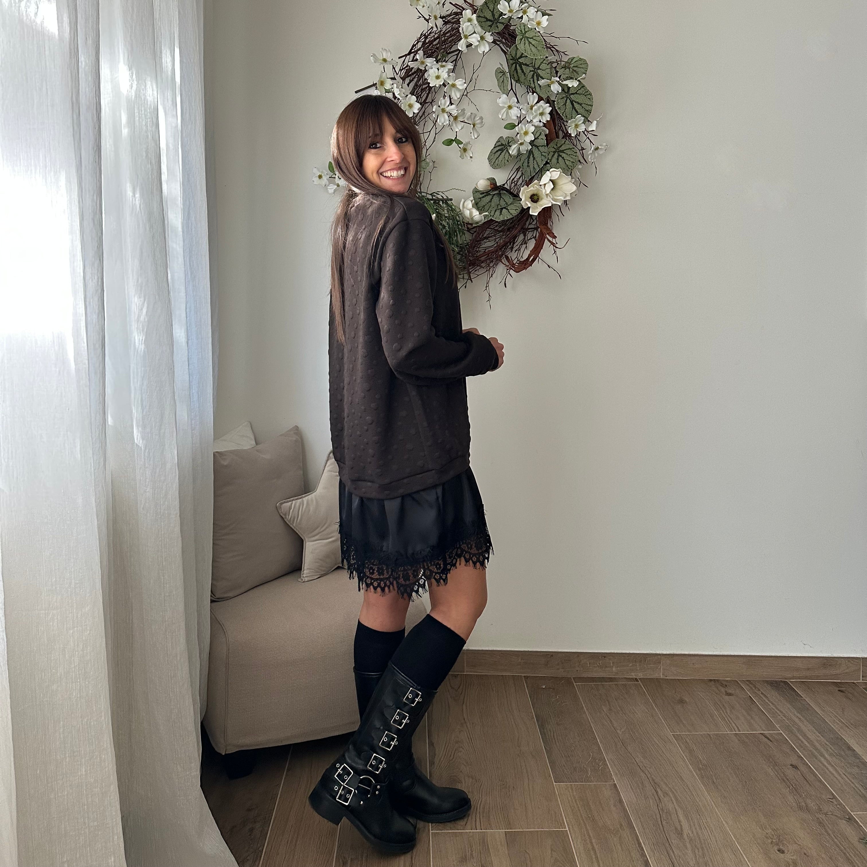 Abito in felpa con tessuto a bolle in rilievo, gonna in satein con pizzo attaccata.