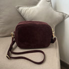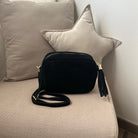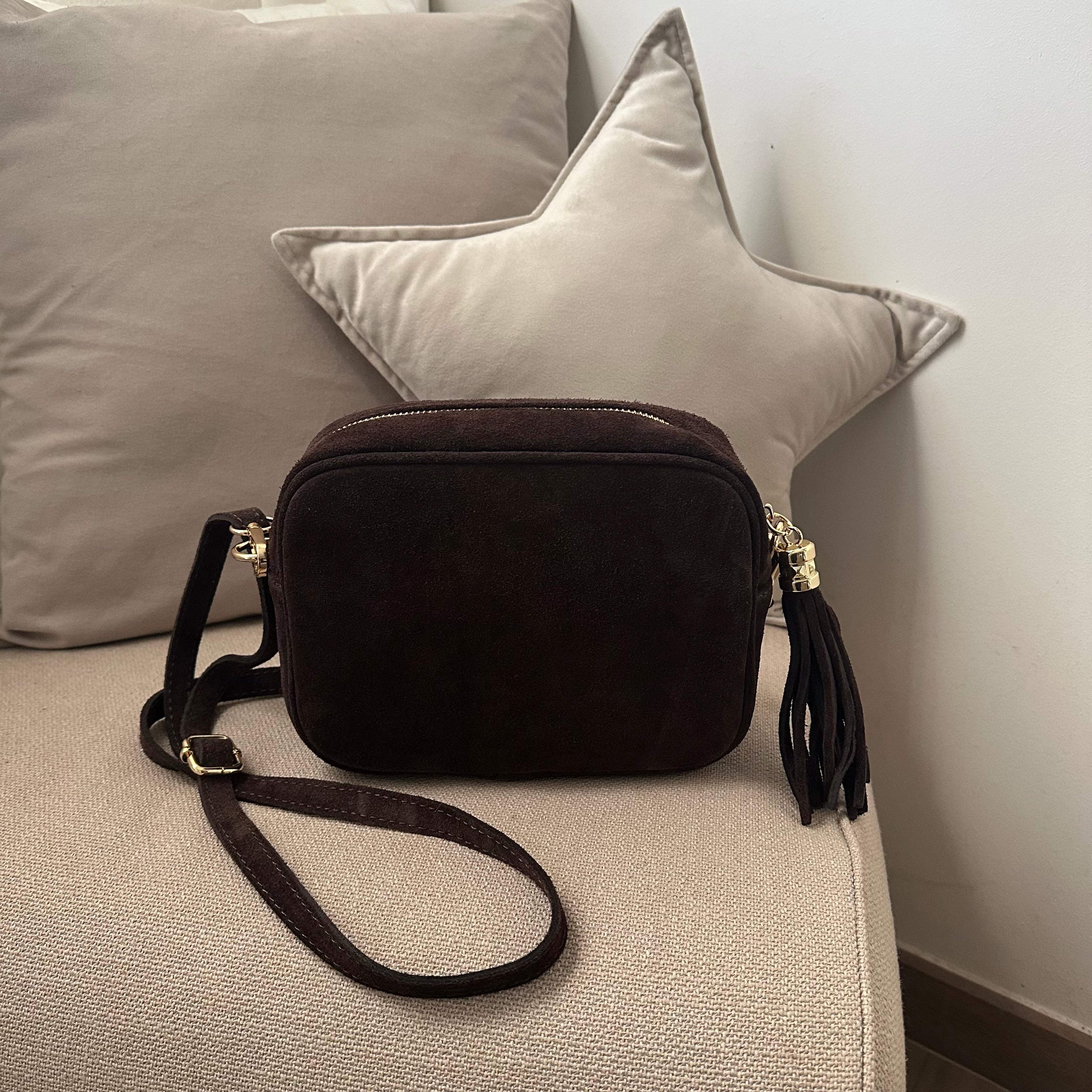 Borsa a tracolla in vera pelle scamosciata con nappina e dettagli dorati, modello quadrato, pratica chiusura con zip e tracolla regolabile e removibile.