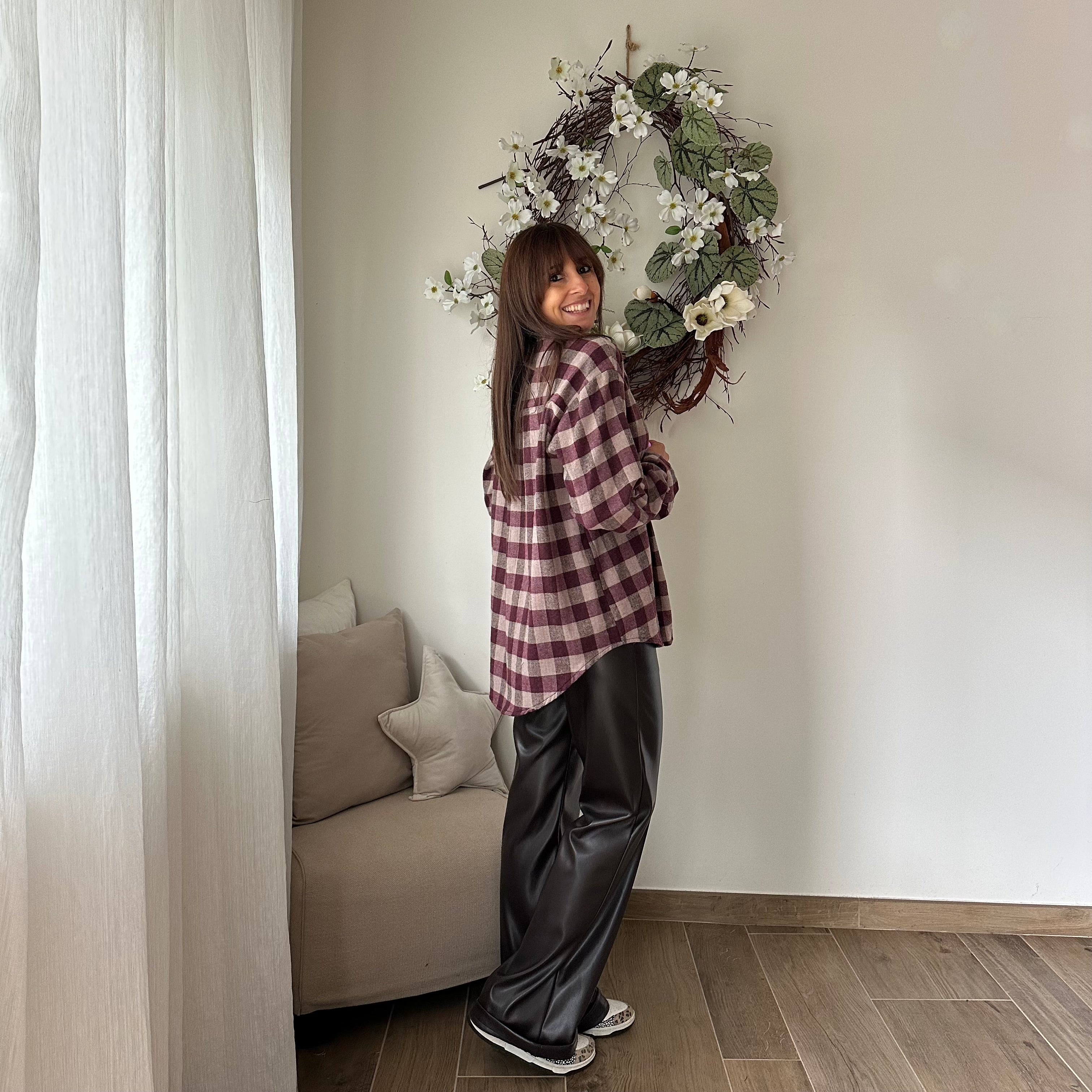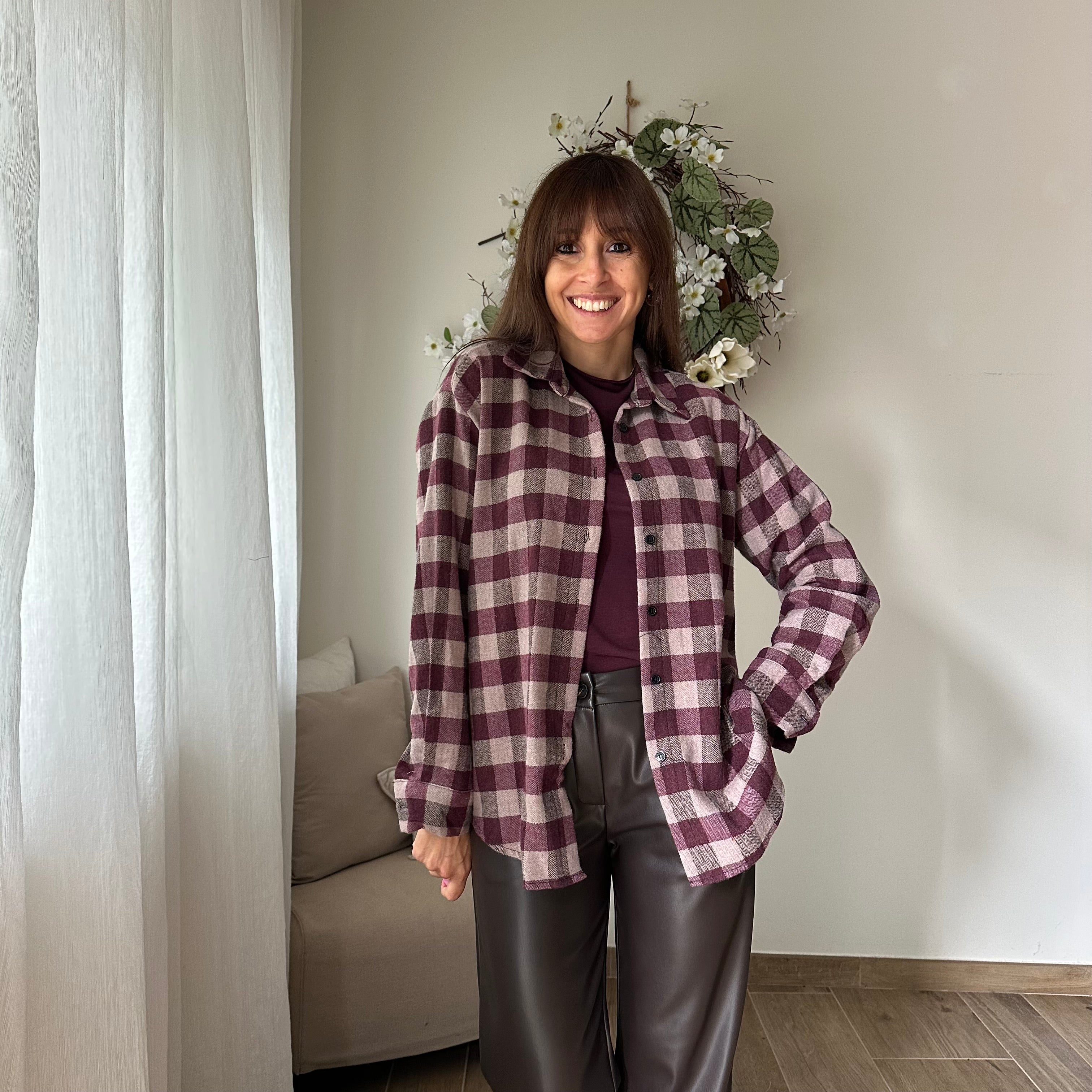 Camicia in flanella a quadri Bordeaux e beige, taglio over