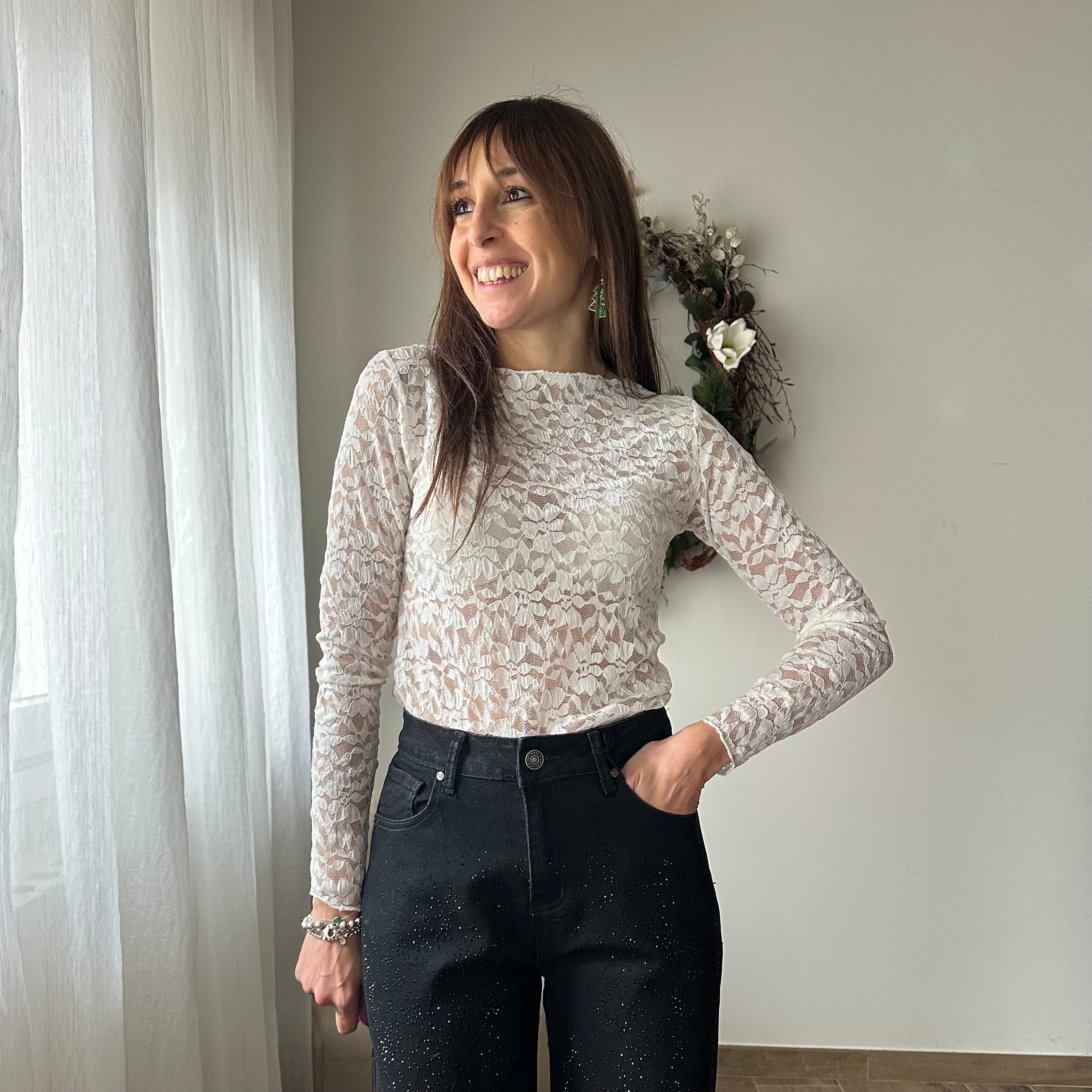 Maglia a maniche lunghe in pizzo nero silhouette aderente