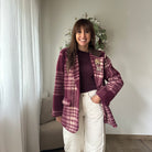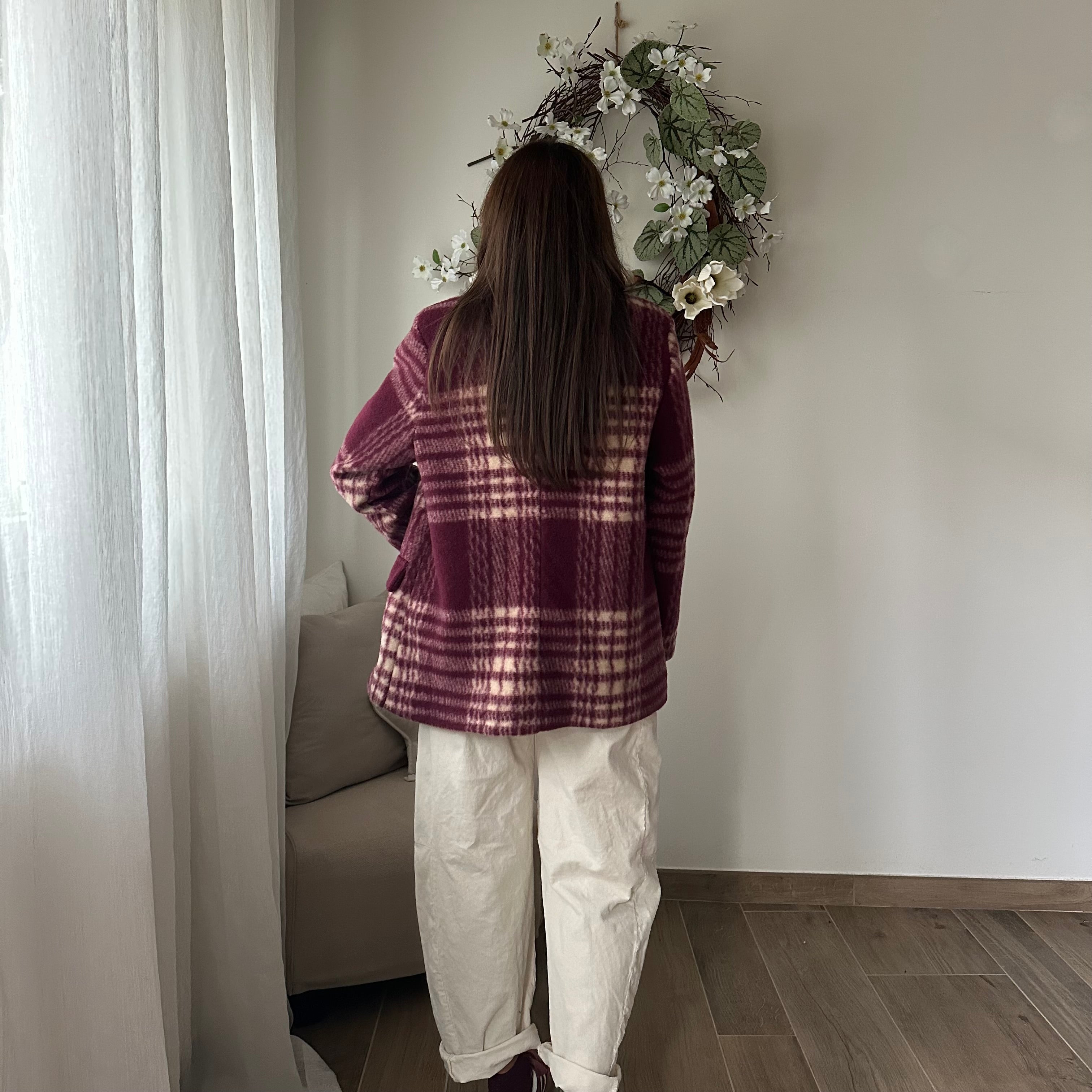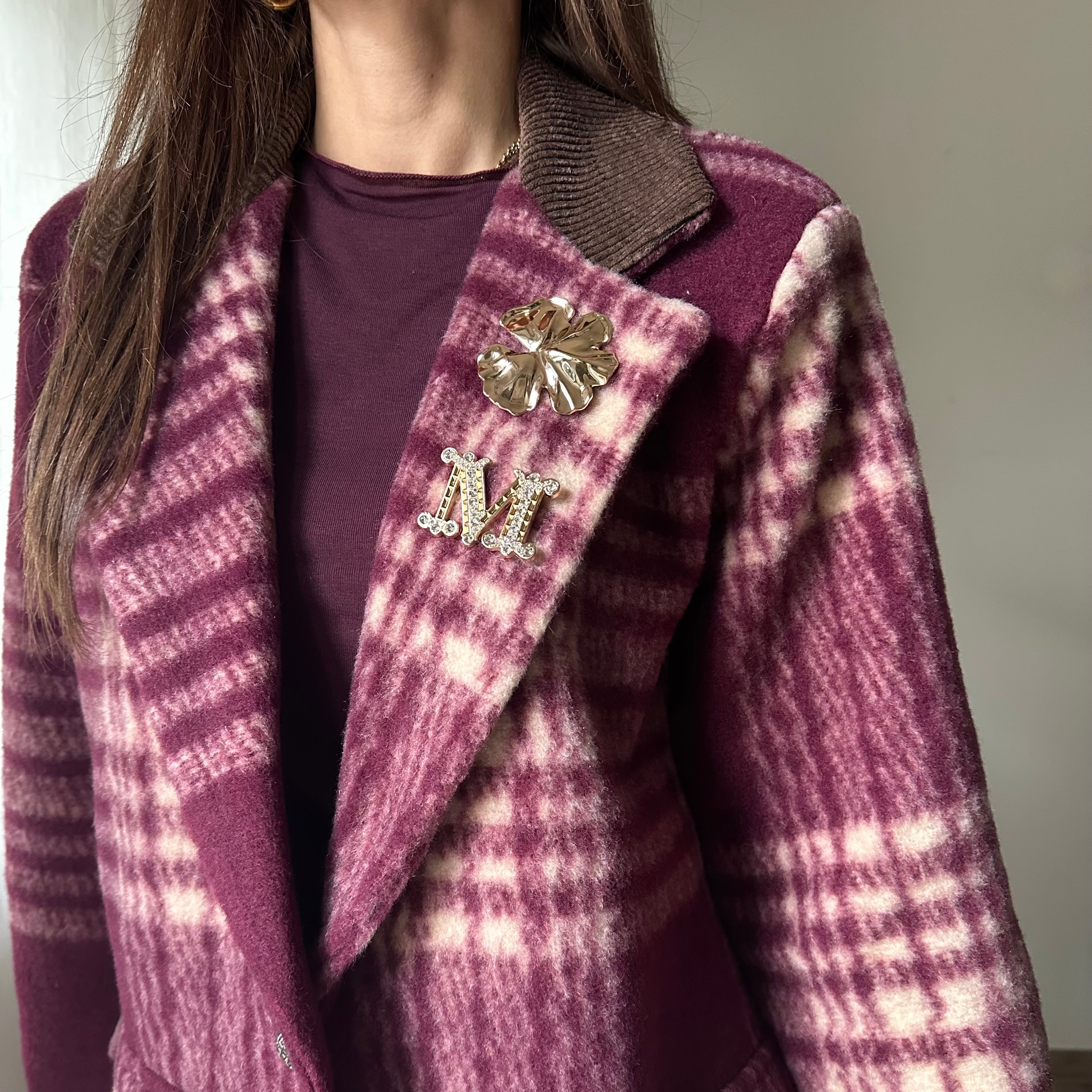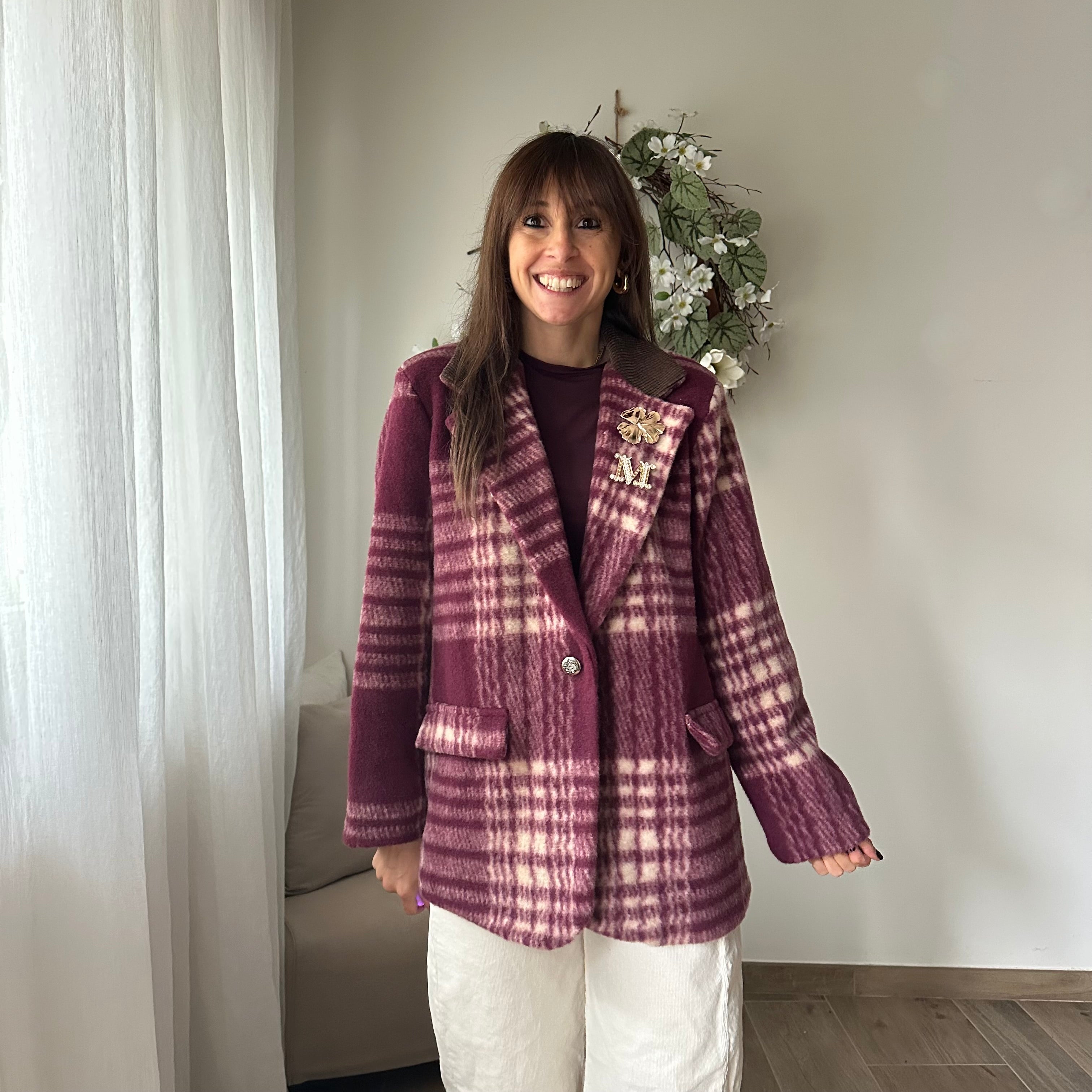 Giacca cappotto check in panno sui toni del bordeaux e panna con colletto in velluto marrone e spille sul revers. Chiusura con un bottone, tasche finte, spalle imbottite.