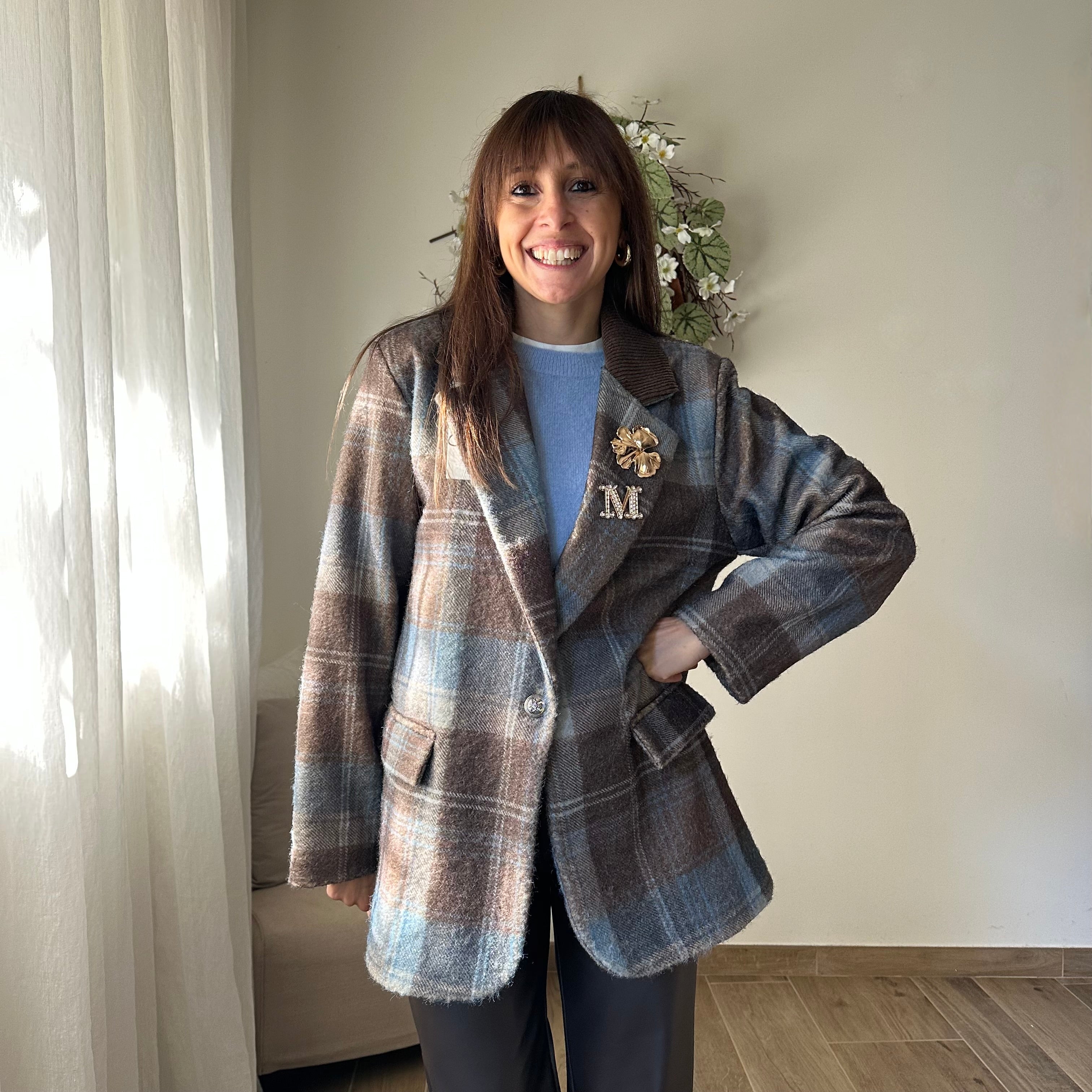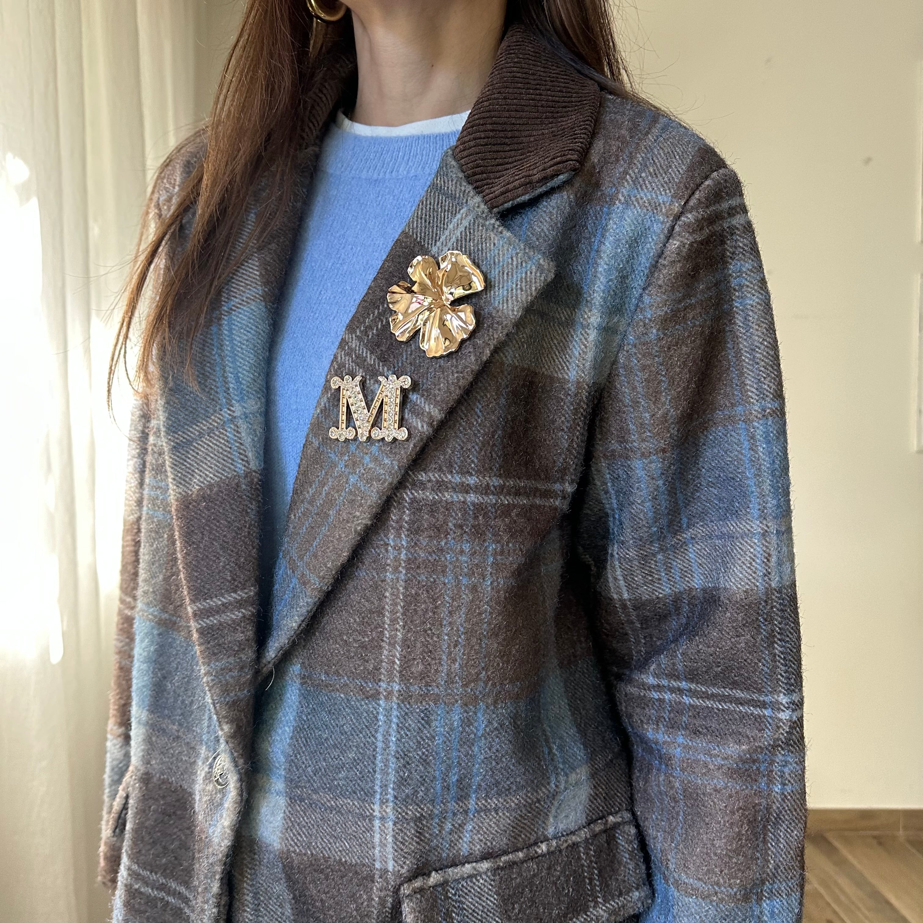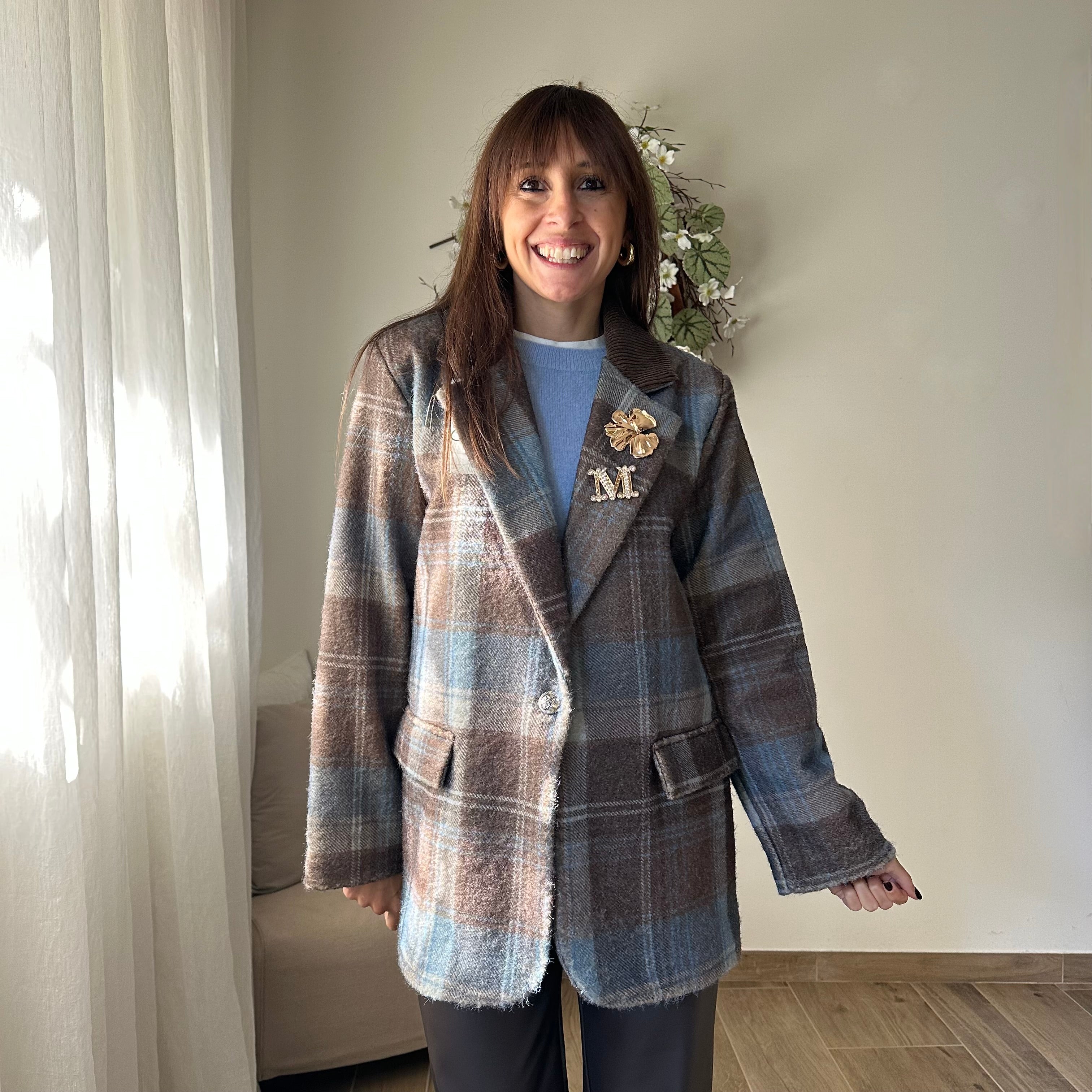 Blazer cappotto fit oversize, fodera interna, bottone di chiusura e tasche finte. Colletto in velluto marrone e spille sul rever removibili