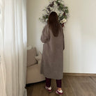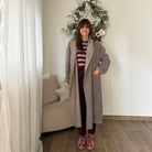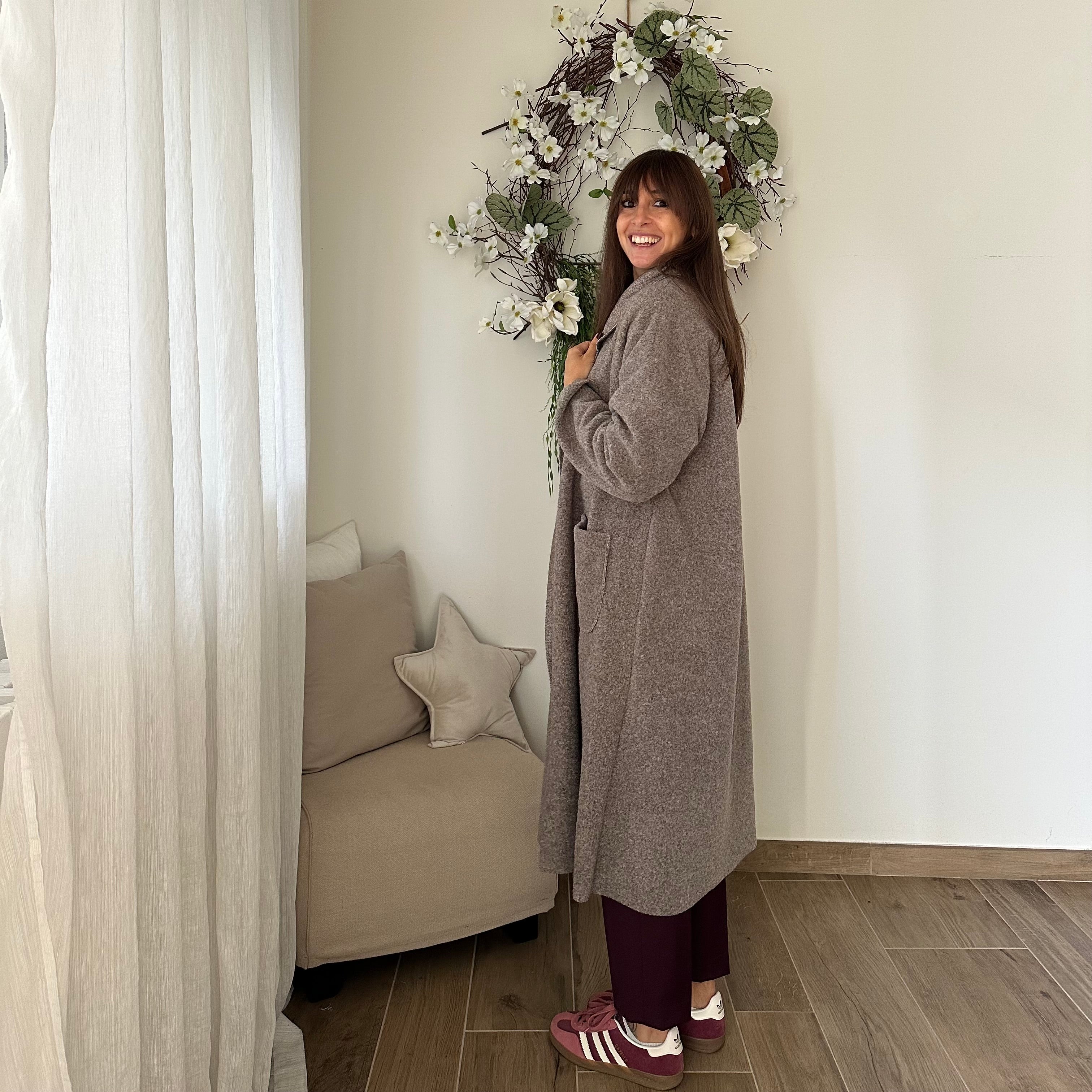 cappotto cardigan lungo, collo a scialle, scende aperto con tasche laterali.