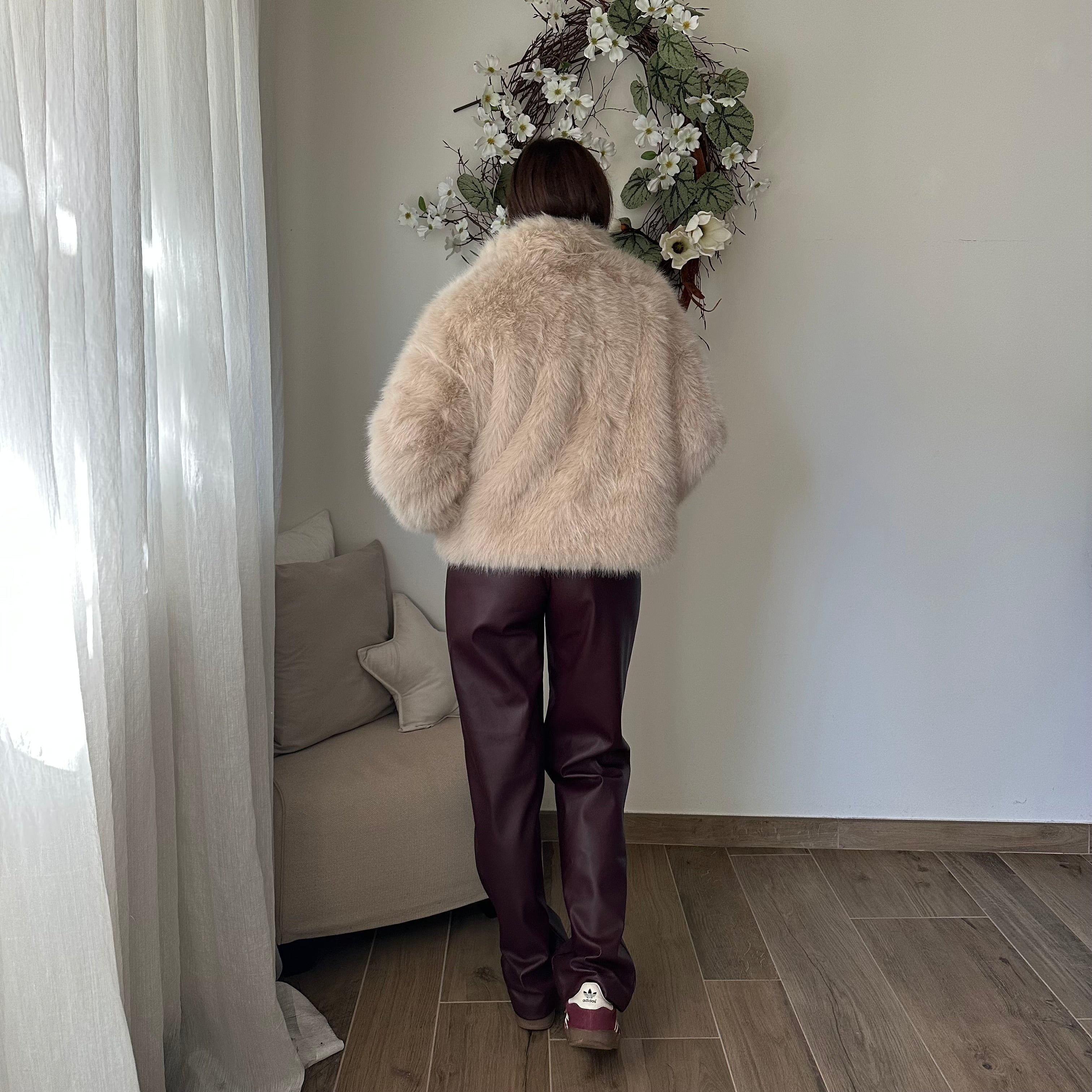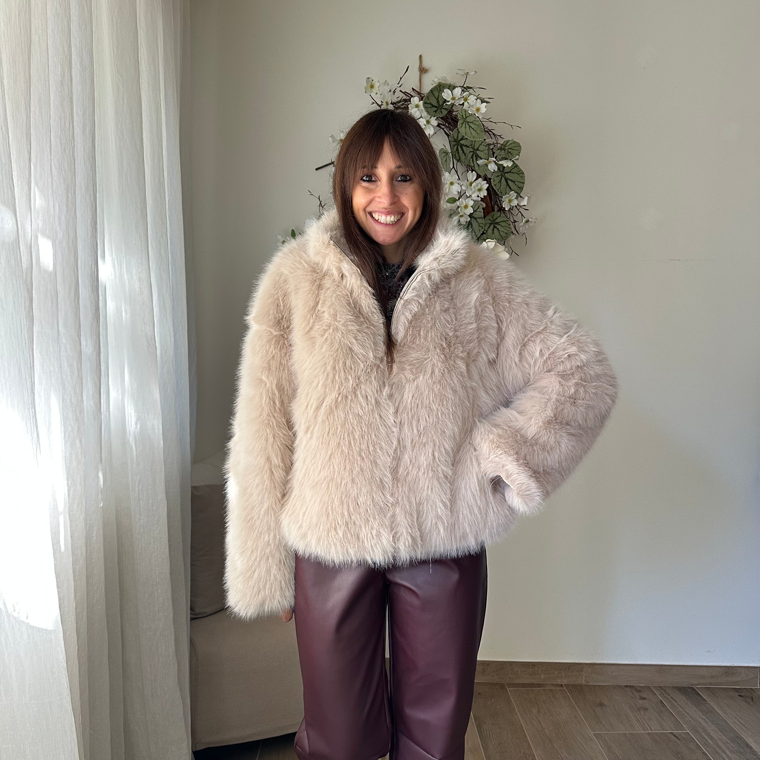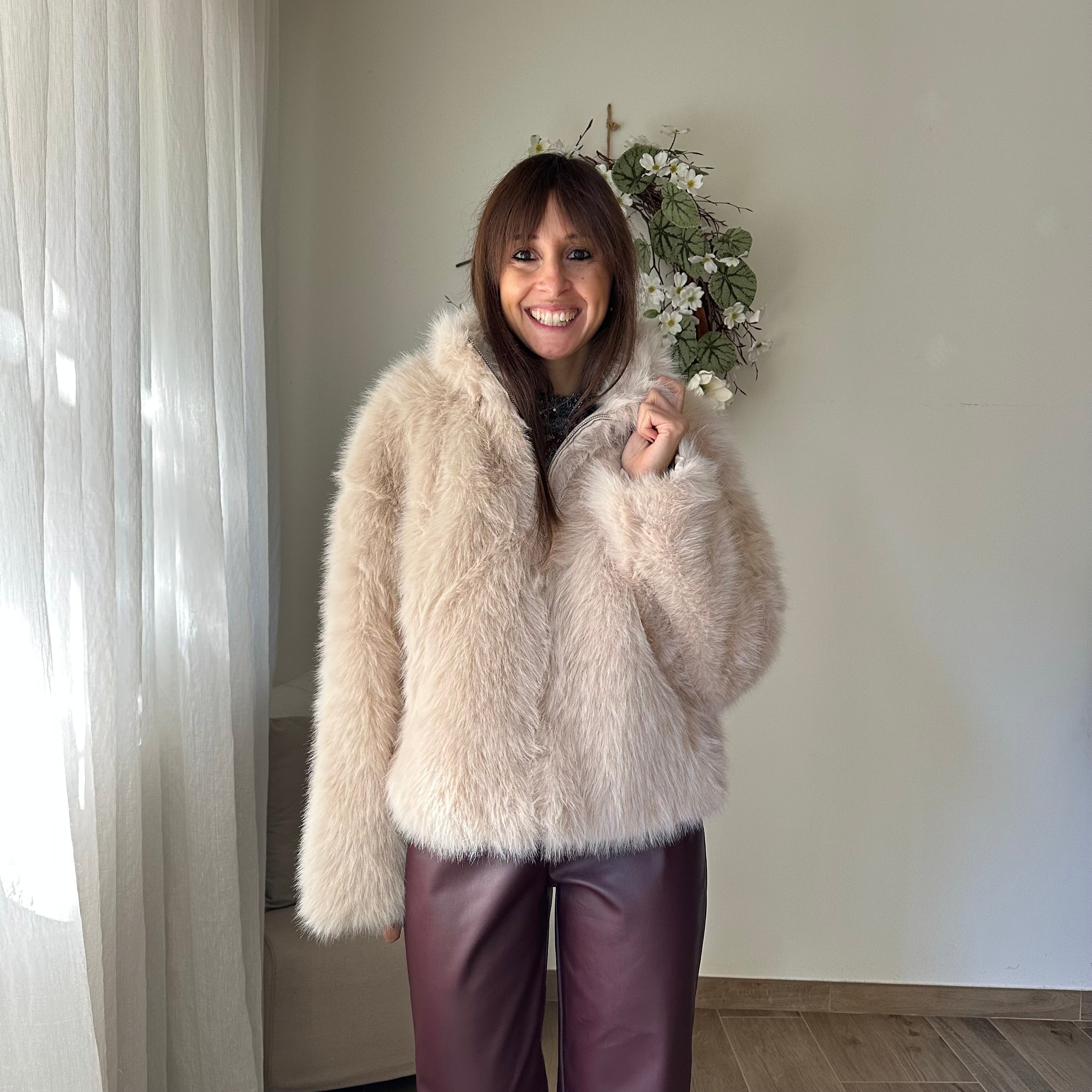 Ecopelliccia collo alto, pelo corto super morbida, chiusura con Zip e tasche laterali, foderata. Taglia unica veste fino una L