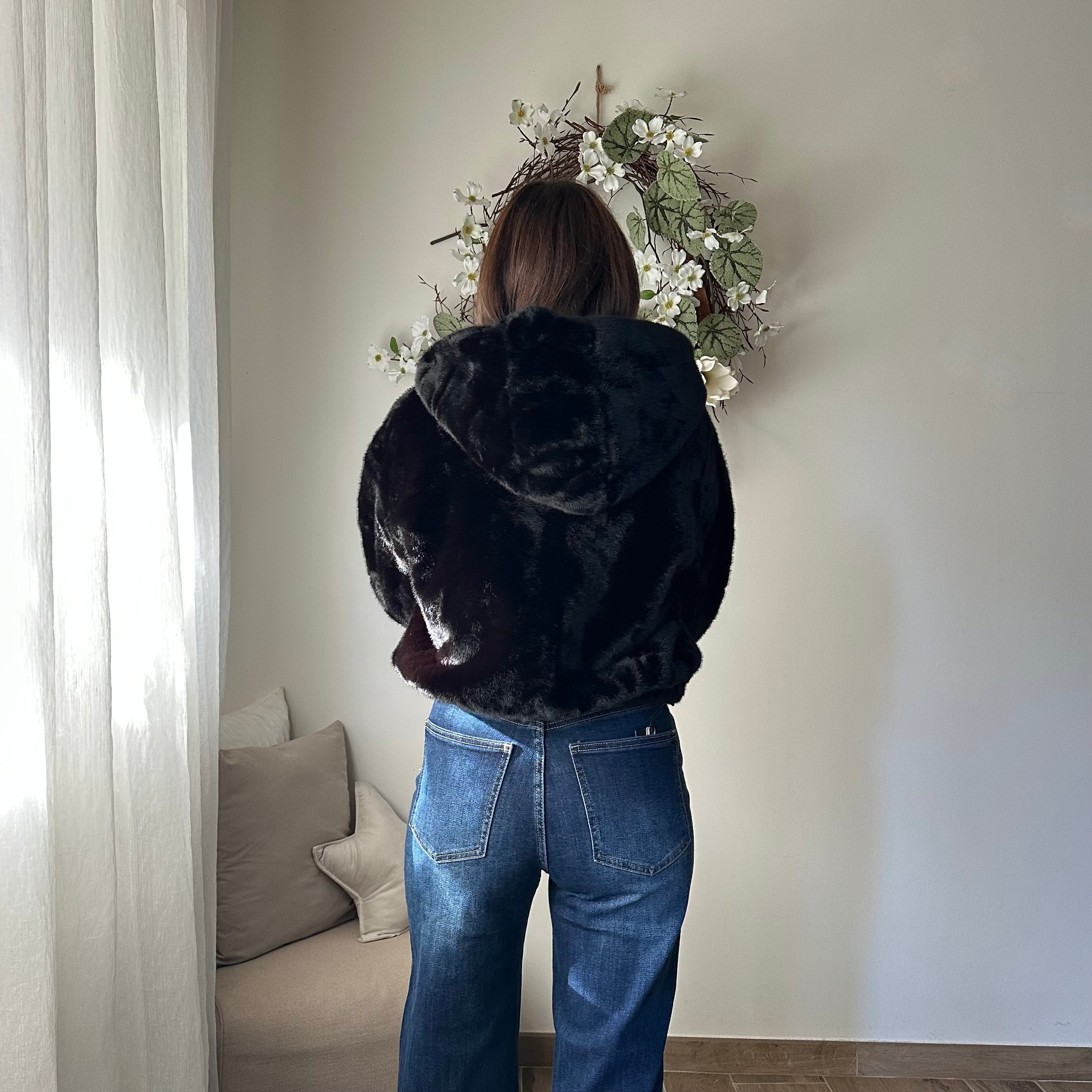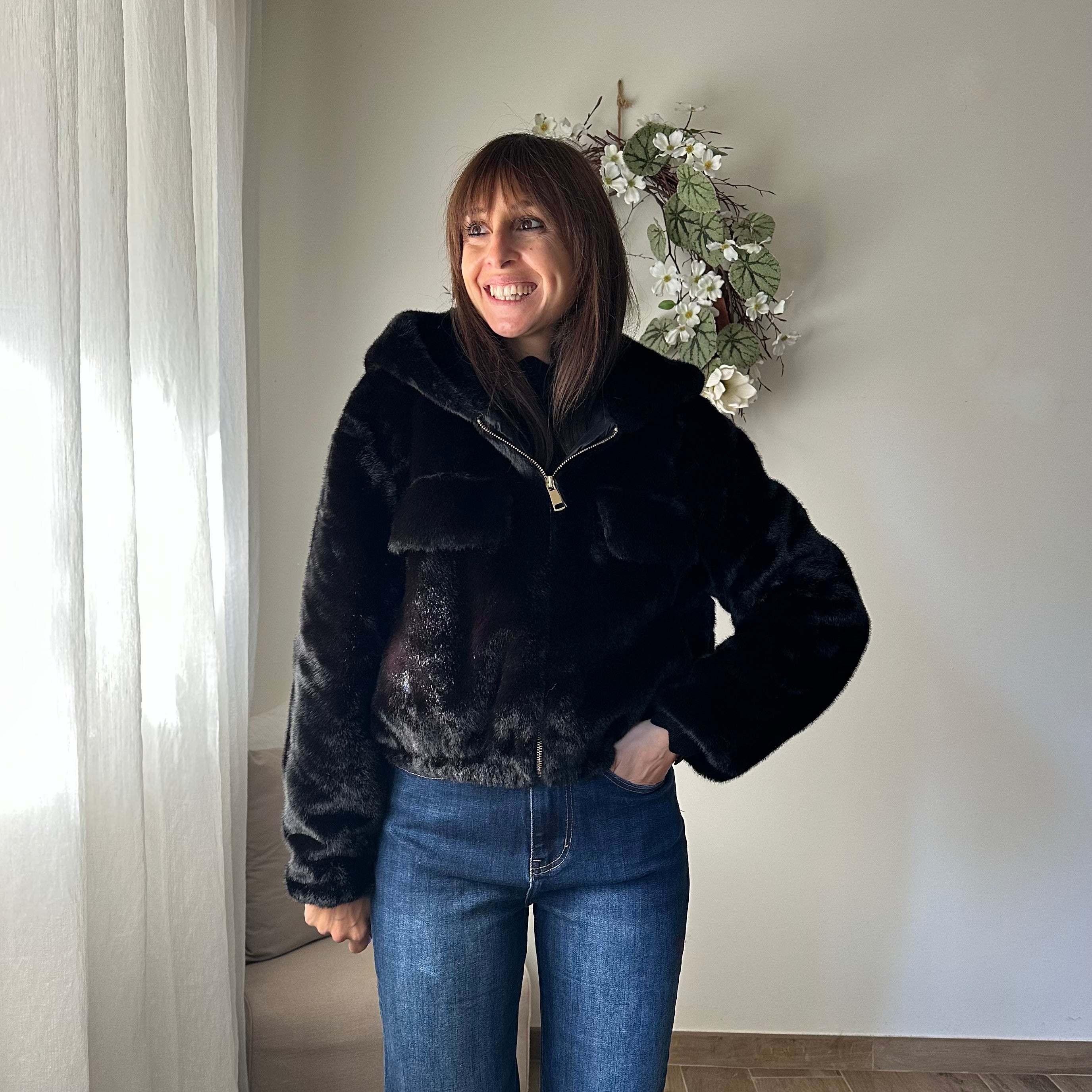 Ecopelliccia Bomber corta con elastico sul fondo, cappuccio, tasche laterali e zip di chiusura. Foderata