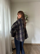 giacca svasata scozzese con bottoni di chiusura sul davanti, manica ampia, svasata.