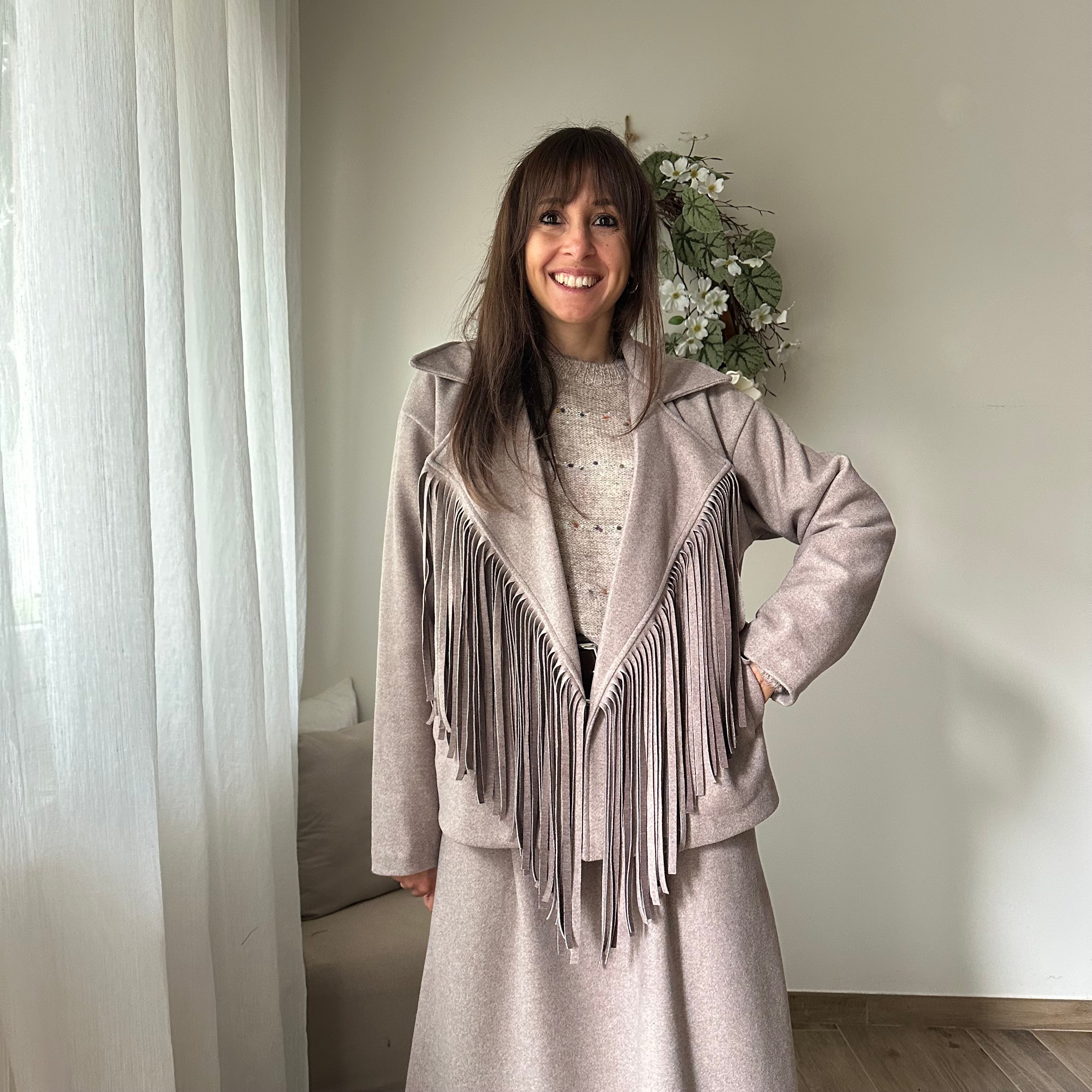 giacca cappotto con frange sul davanti, fodera interna e tasche laterali