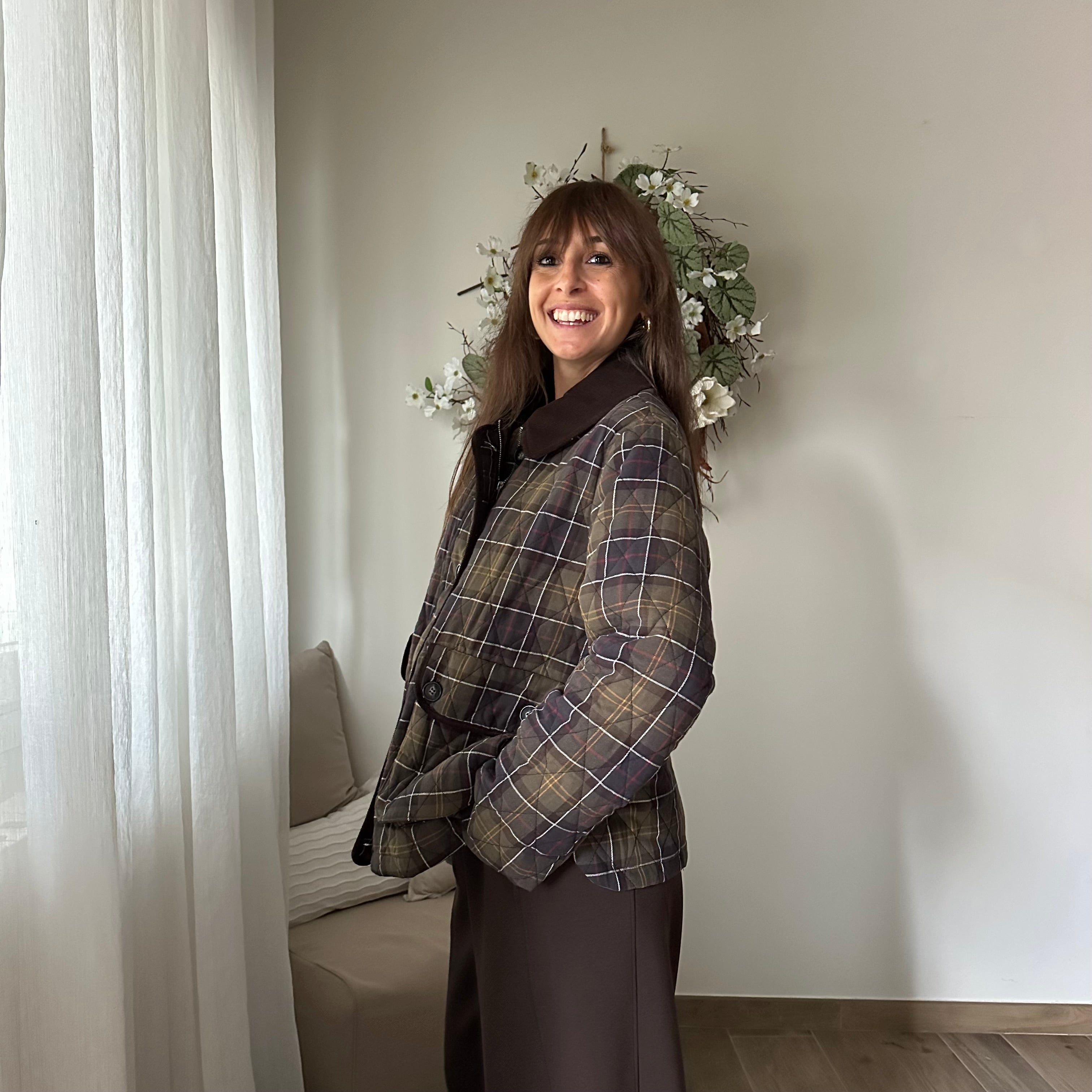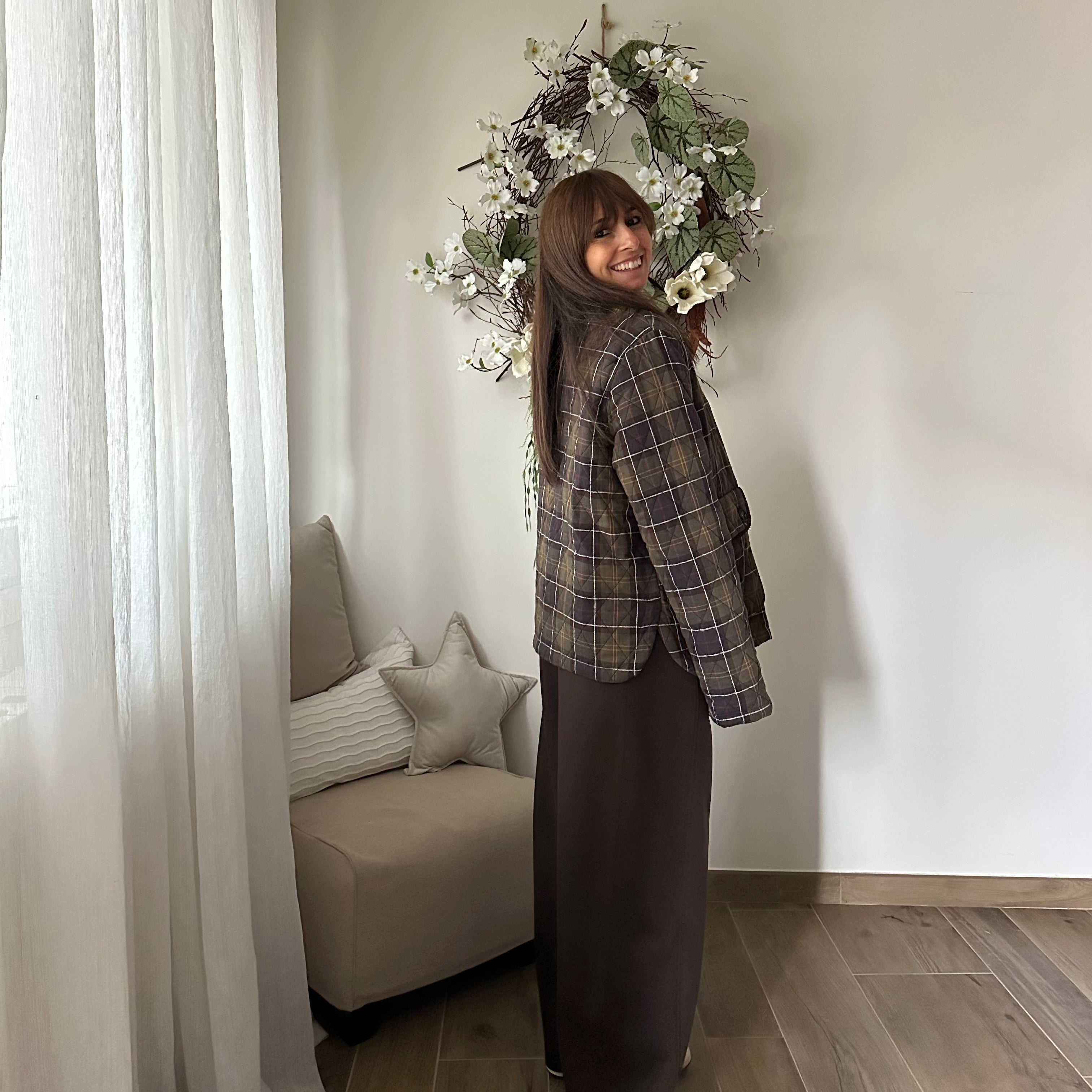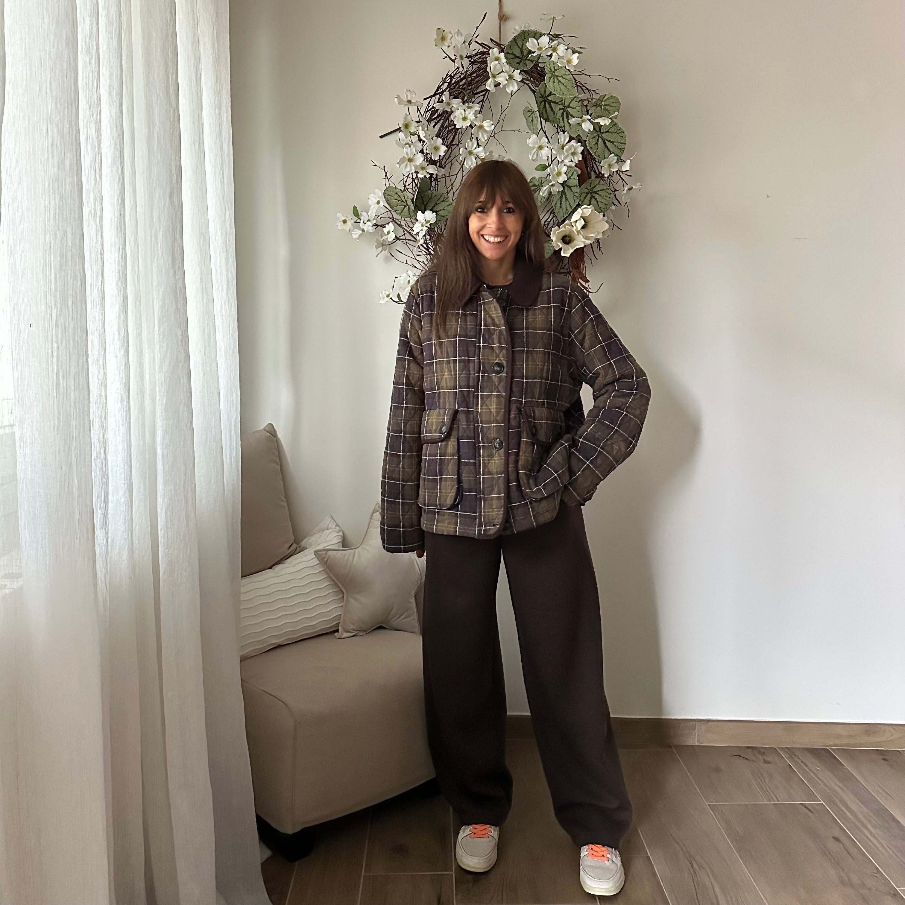 colletto in velluto, taglio camicia, zip di chiusura e bottoni esterni, tasche sul davanti e tasche laterali. Fodera interna