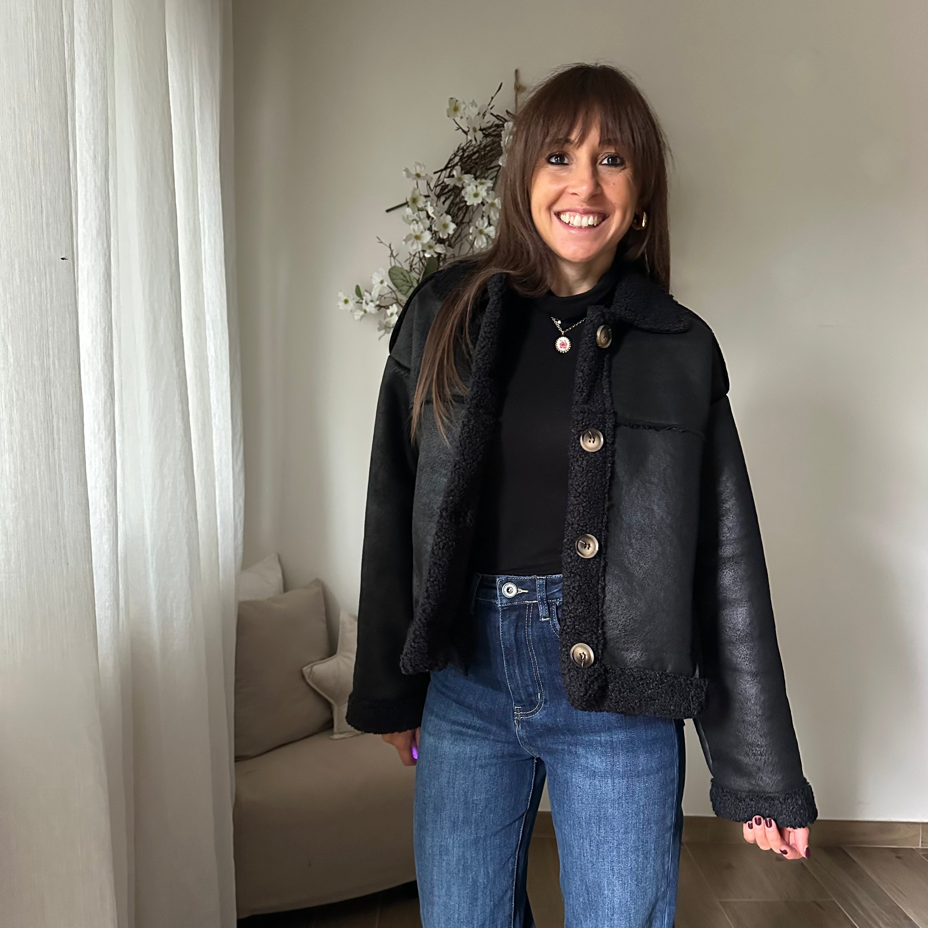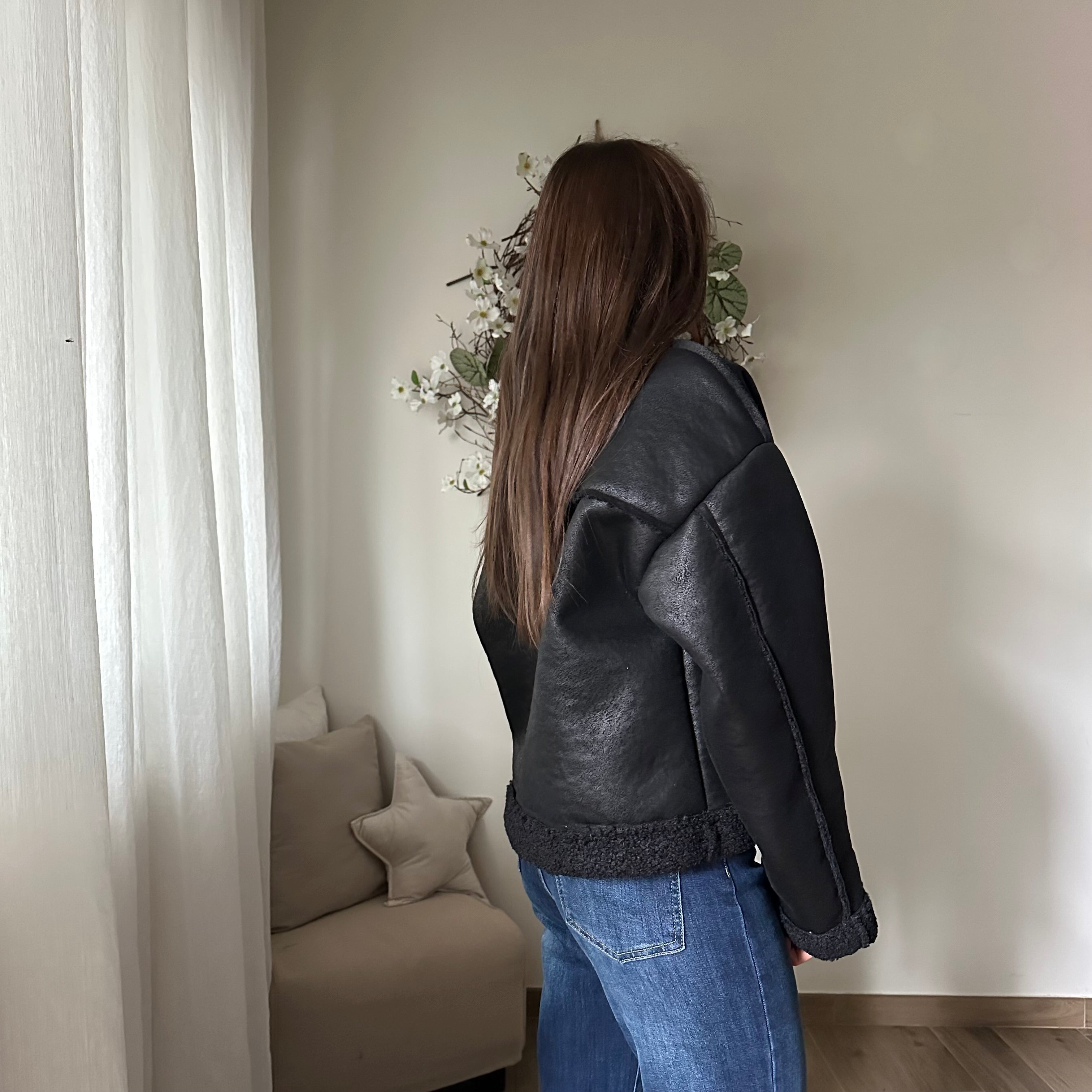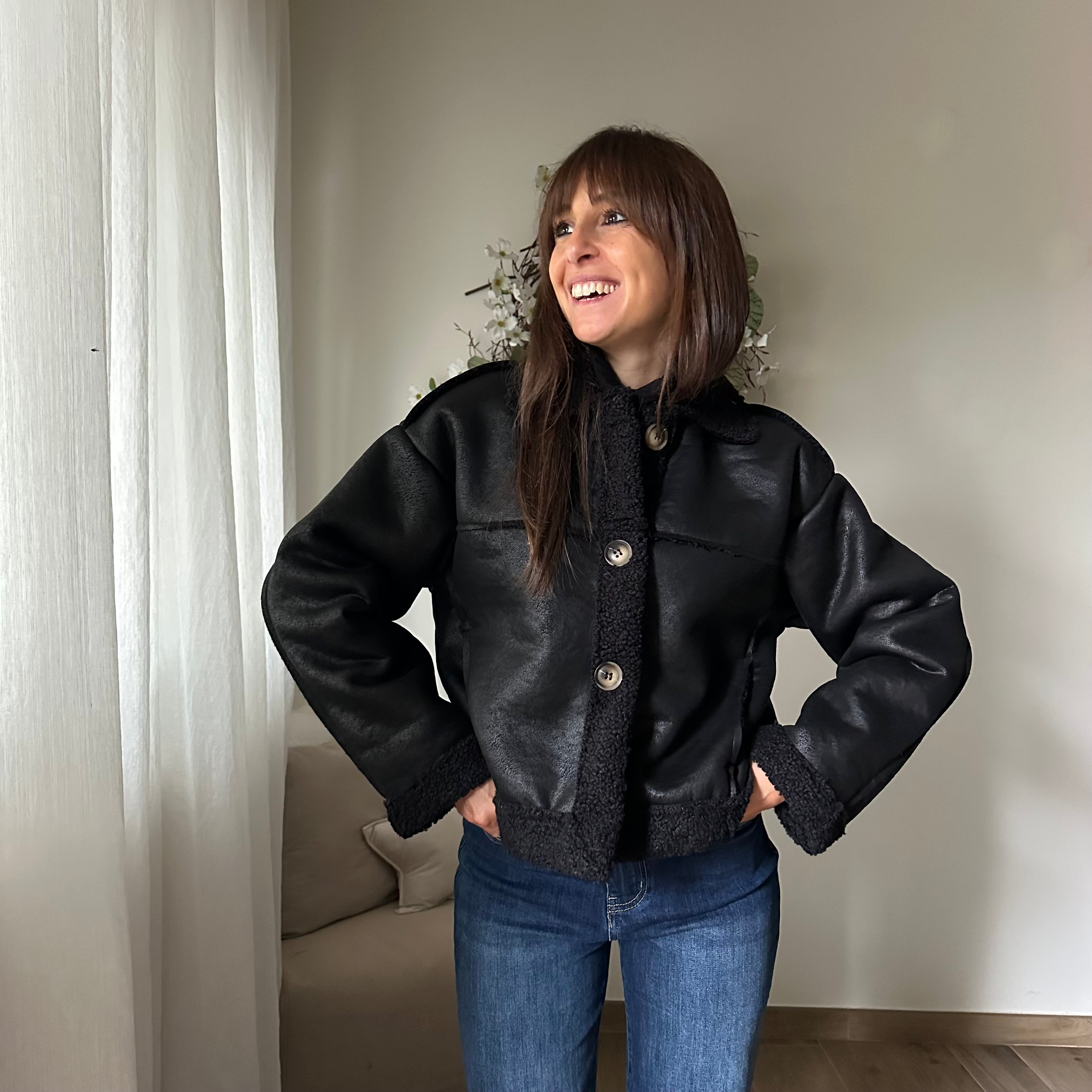 Montone Scamosciato, fit corto, collo camicia e bottoni di chiusura sul davanti, tasche laterali.