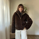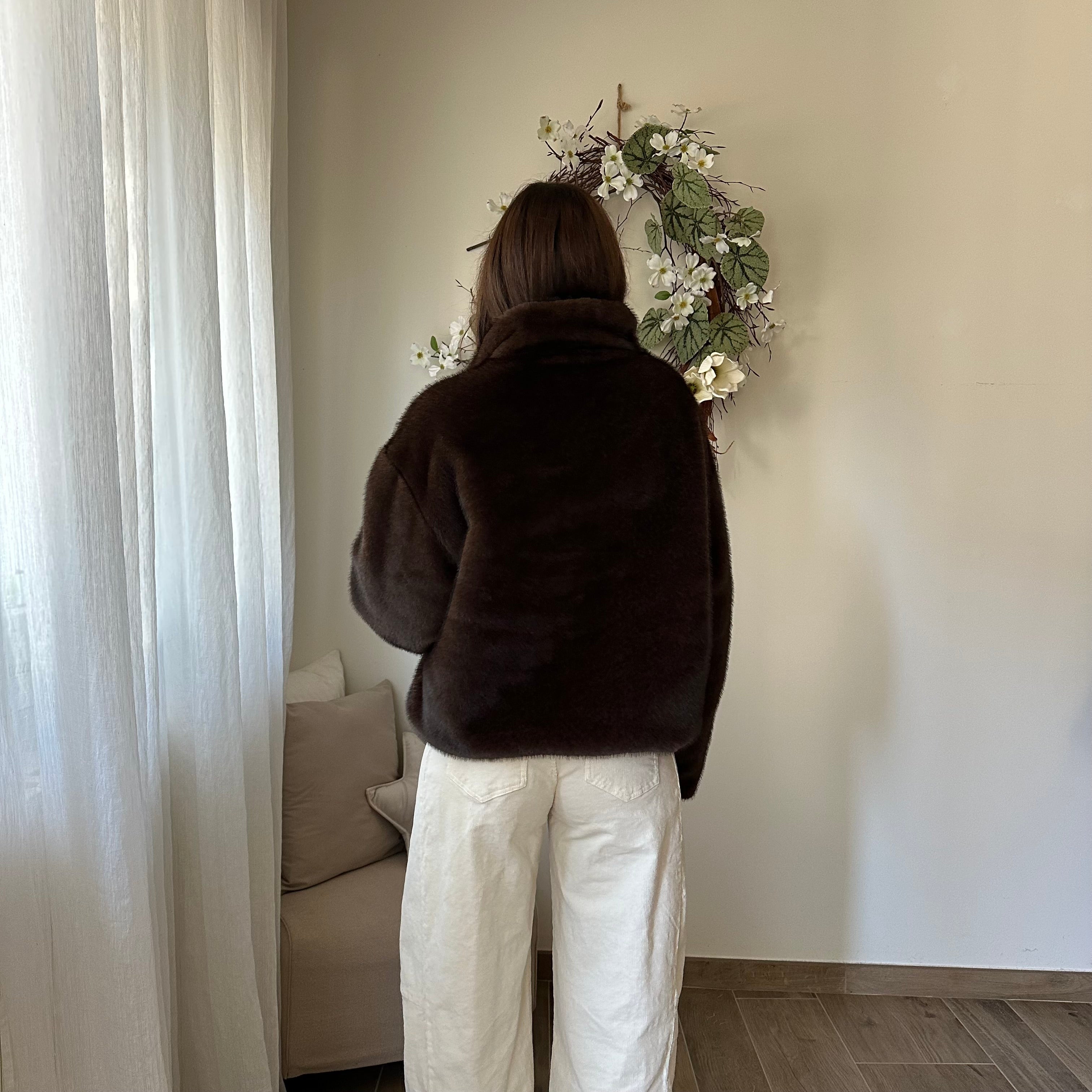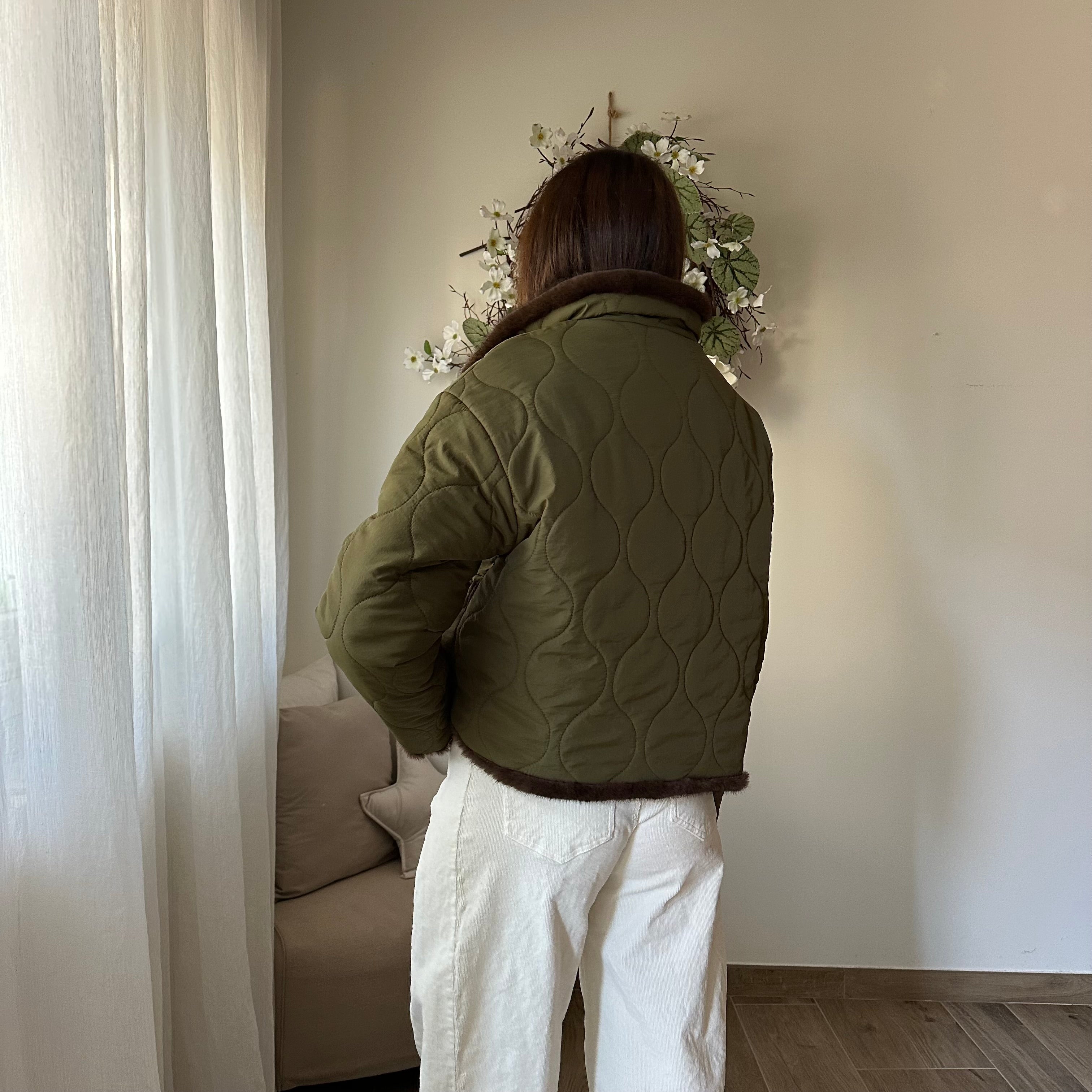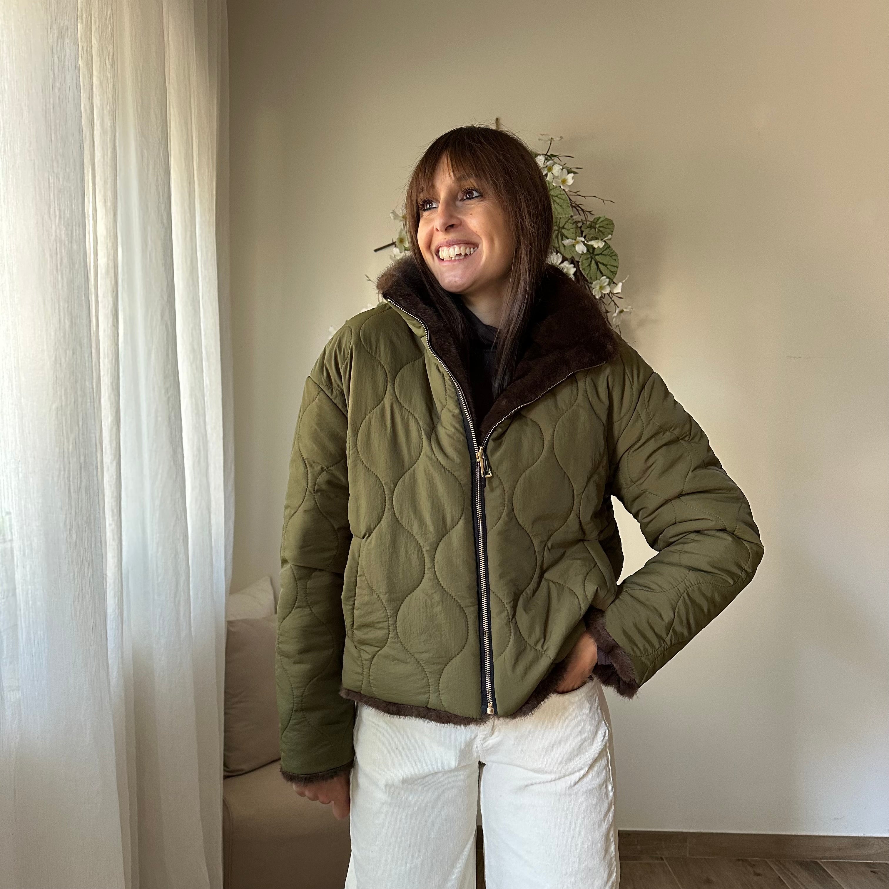 reversibile da una parte pelliccia a pelo corto marrone con zip e tasche laterali, collo alto. dall'altra parte piumino di colore verde sempre con tasche e zip.