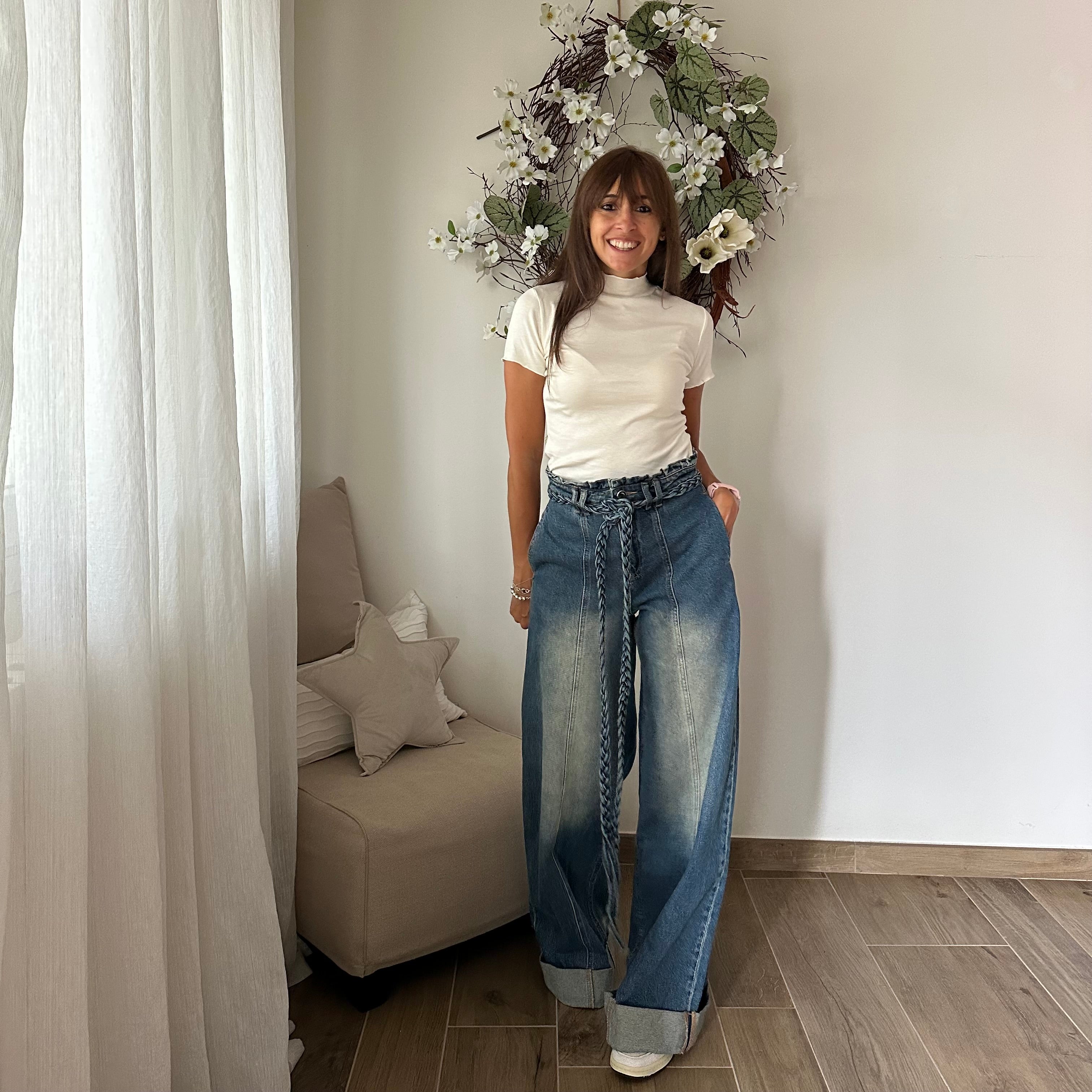 Jeans lungo a palazzo, con doppio risvolto sul fondo cucito, dettaglio cintura intrecciata.
