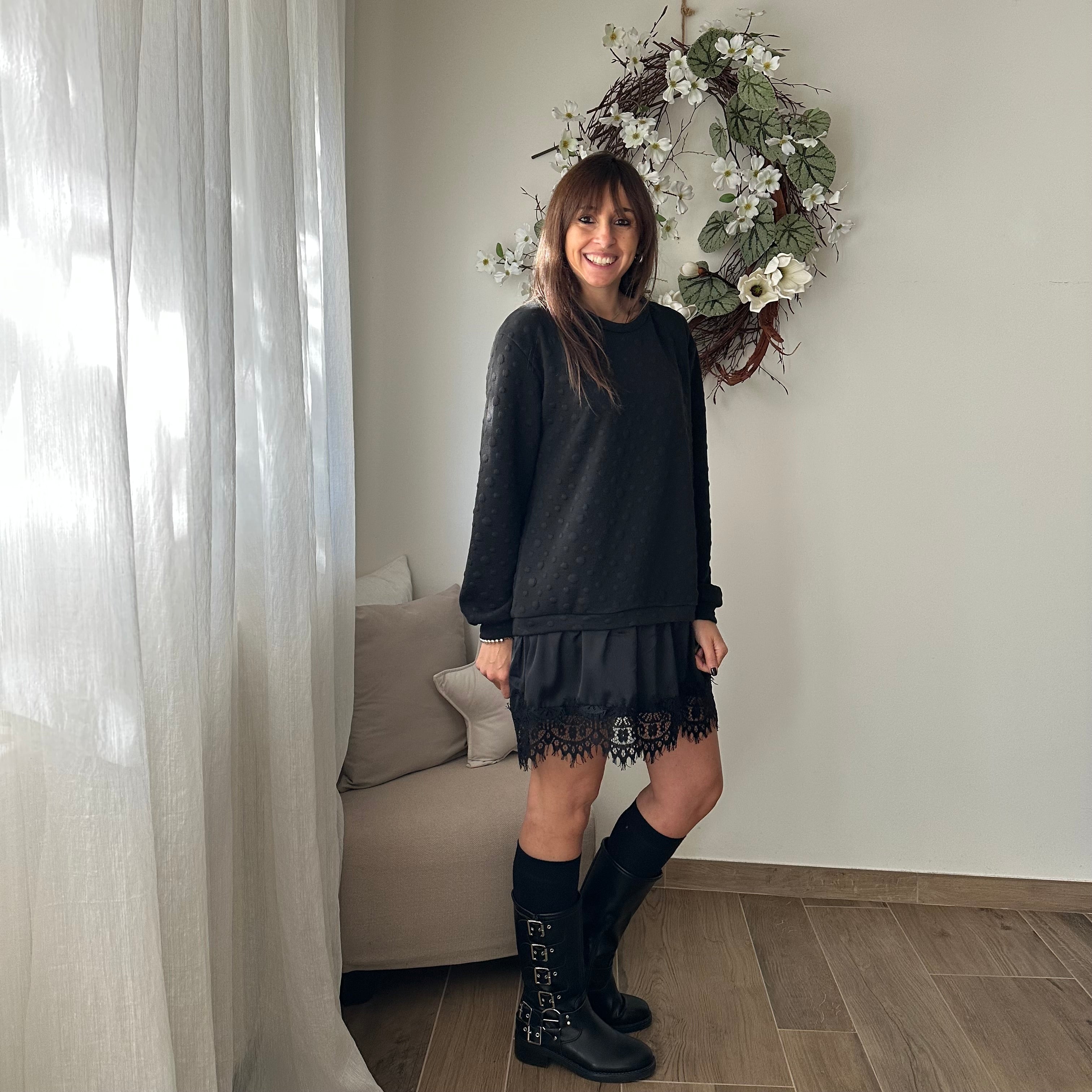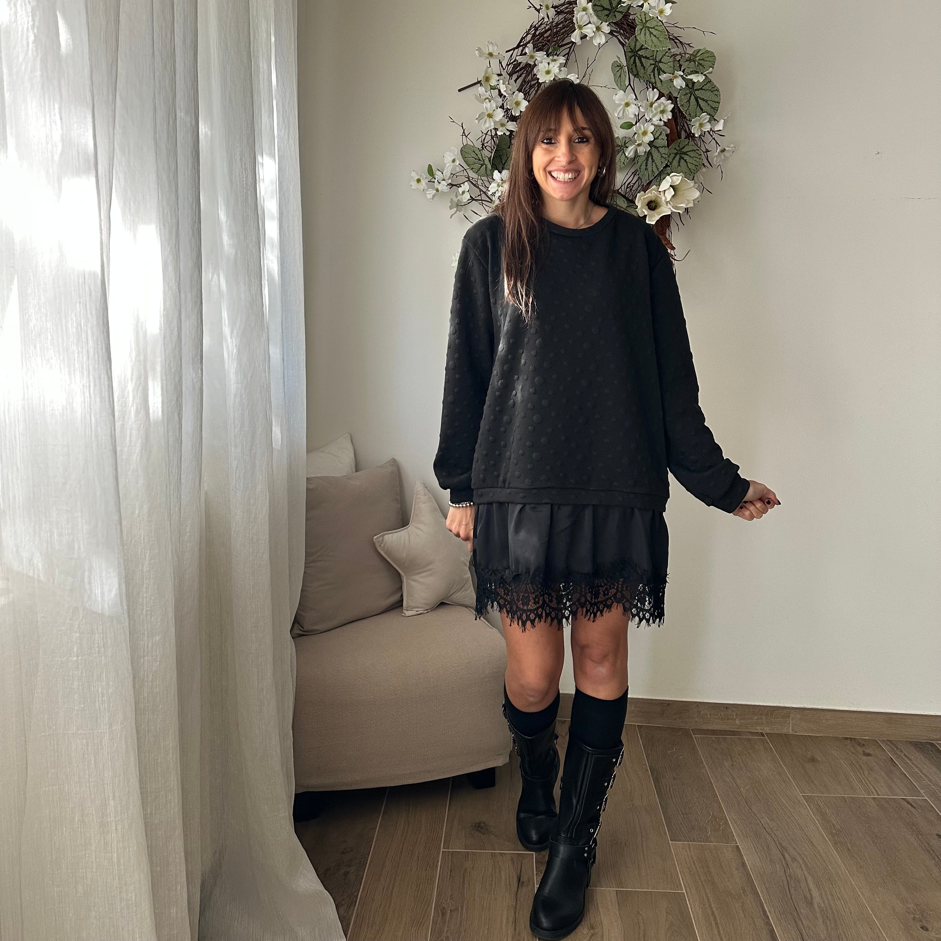 Abito in felpa con tessuto a bolle in rilievo, gonna in satein con pizzo attaccata.