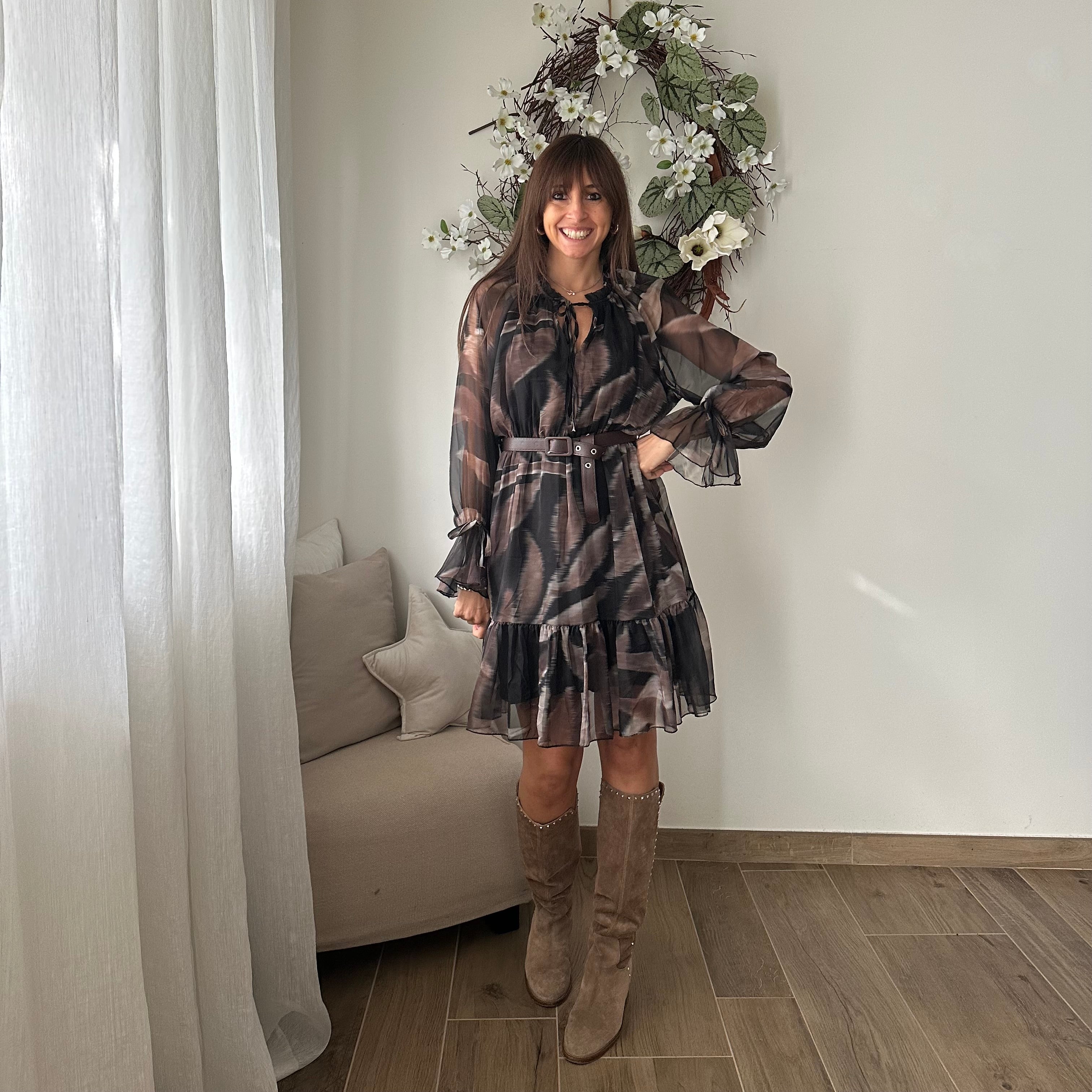 Abitino con elastico in vita e cintura compresa. parte superiore trasparente, manica con elastico sul polso. parte sotto con fodera nera.