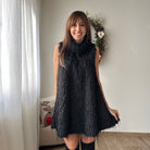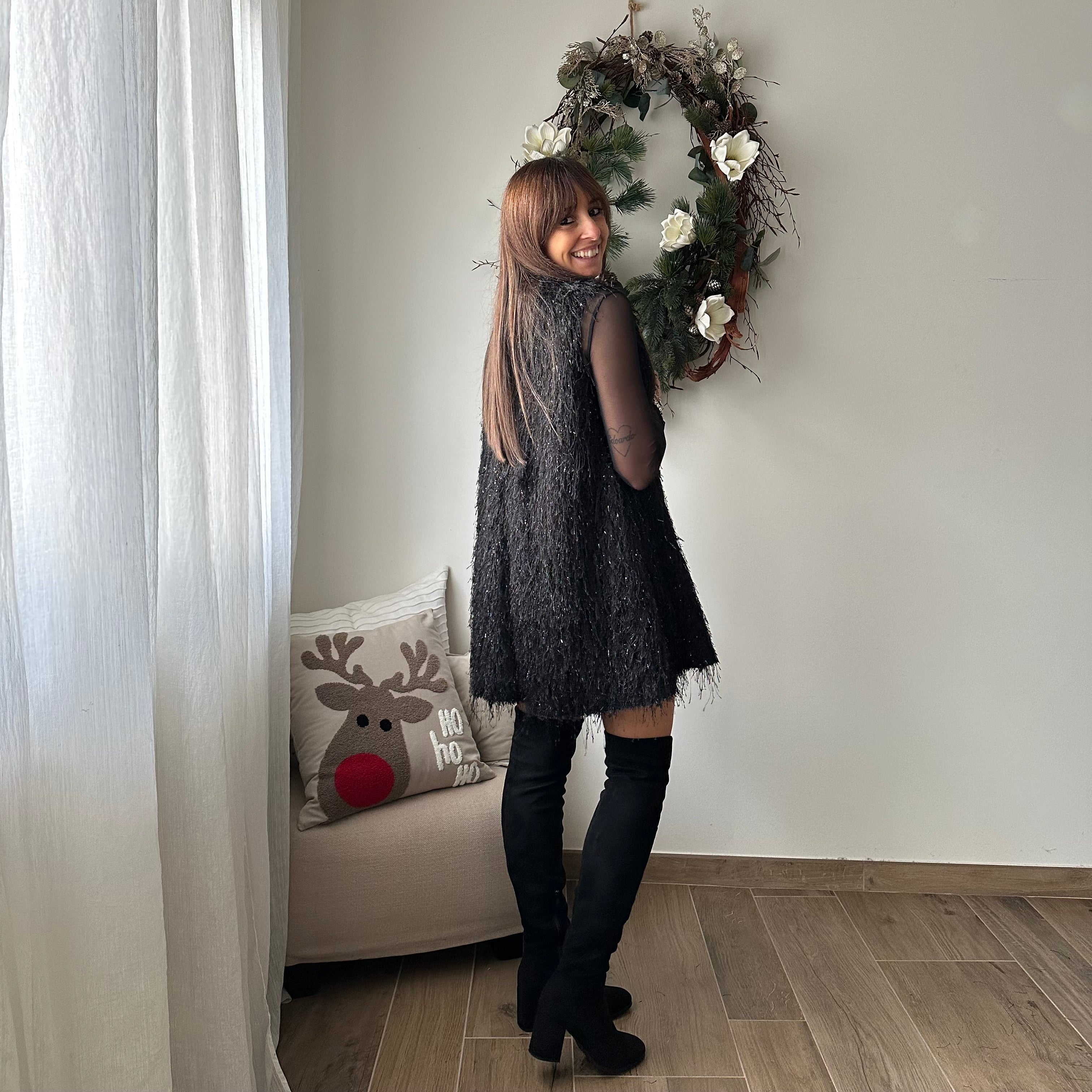 Abito corto svasato con frange soffici, smanicato, chiusura con due bottoni dietro il collo