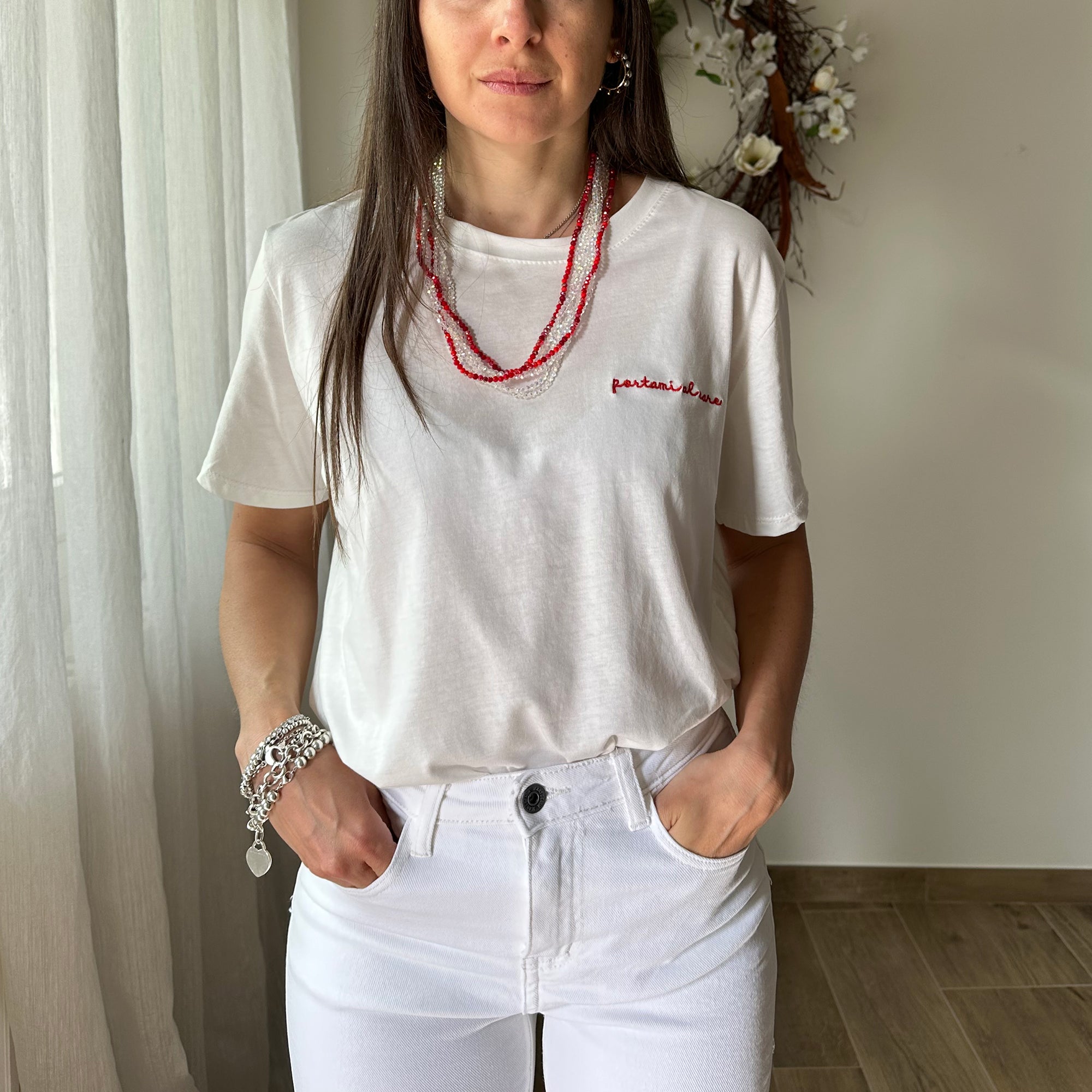 Nella foto Marta indossa due collane cristalli trasparente e una rossa