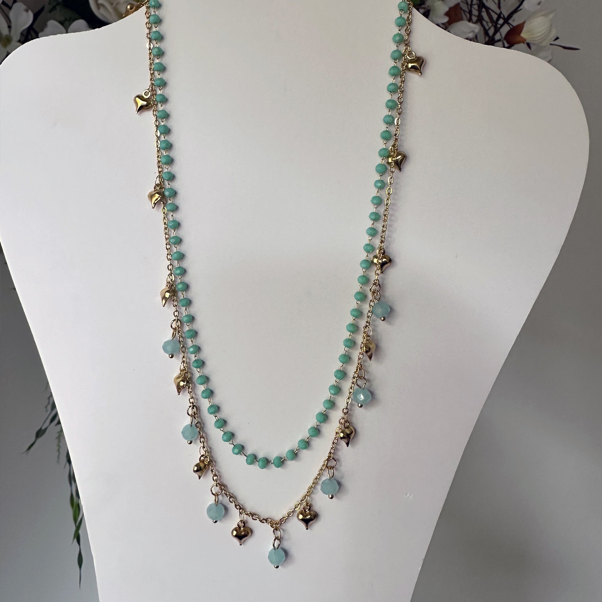 Collana doppia, una parte con cuoricini oro e l'altra di perline verde acqua, lunghezza regolabile