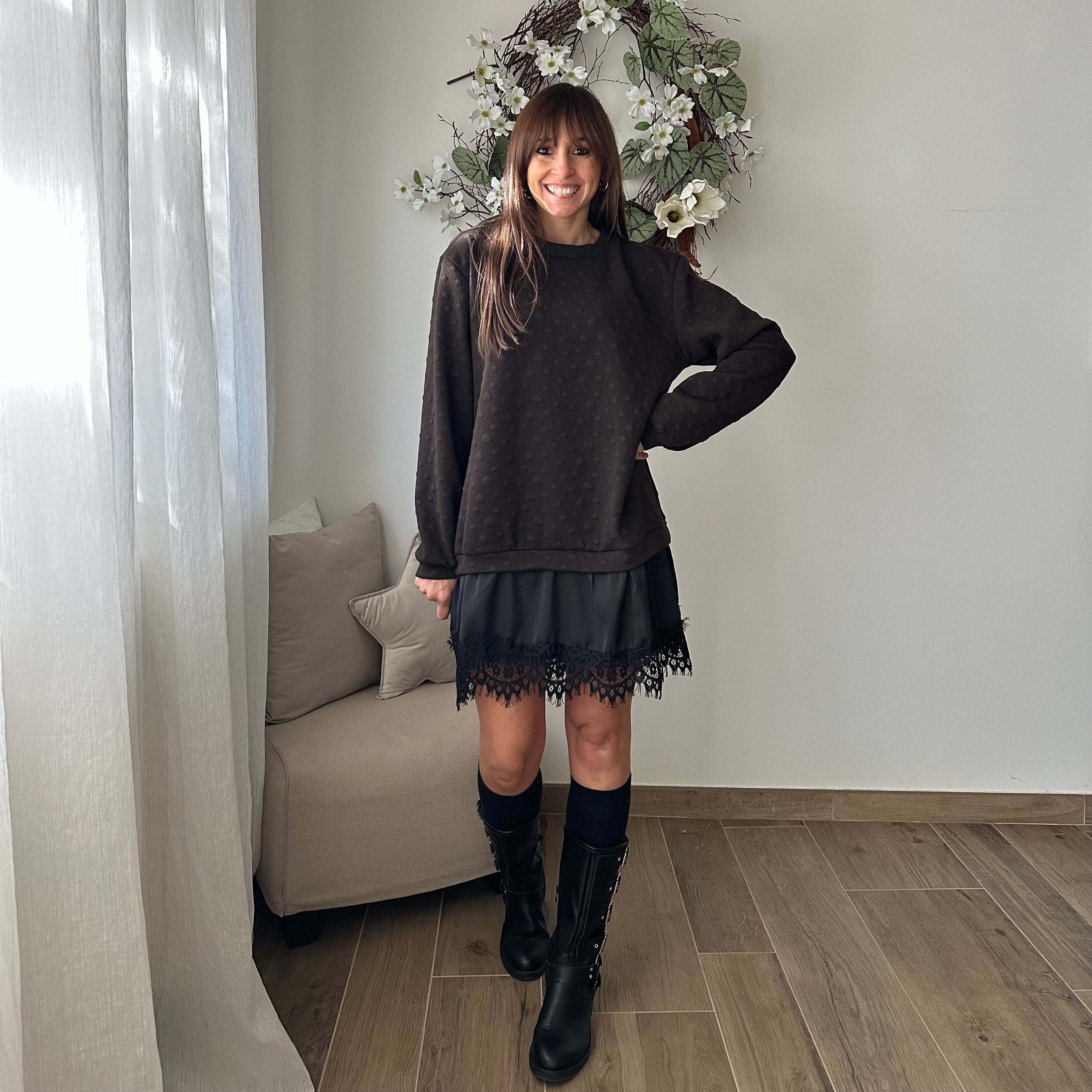 Abito in felpa con tessuto a bolle in rilievo, gonna in satein con pizzo attaccata.