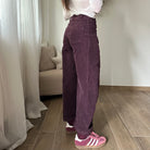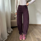 Pantalone in velluto, modello banana, comodo elasticizzato a vita alta.