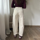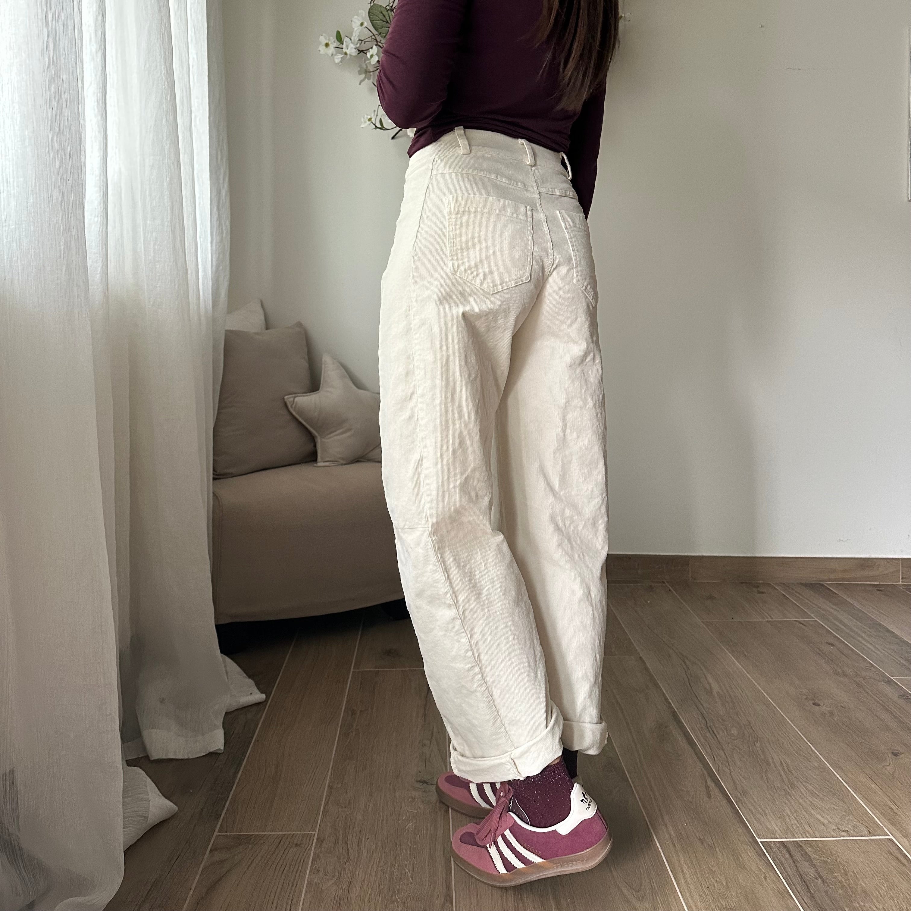 Pantalone in velluto, modello banana, comodo elasticizzato a vita alta.
