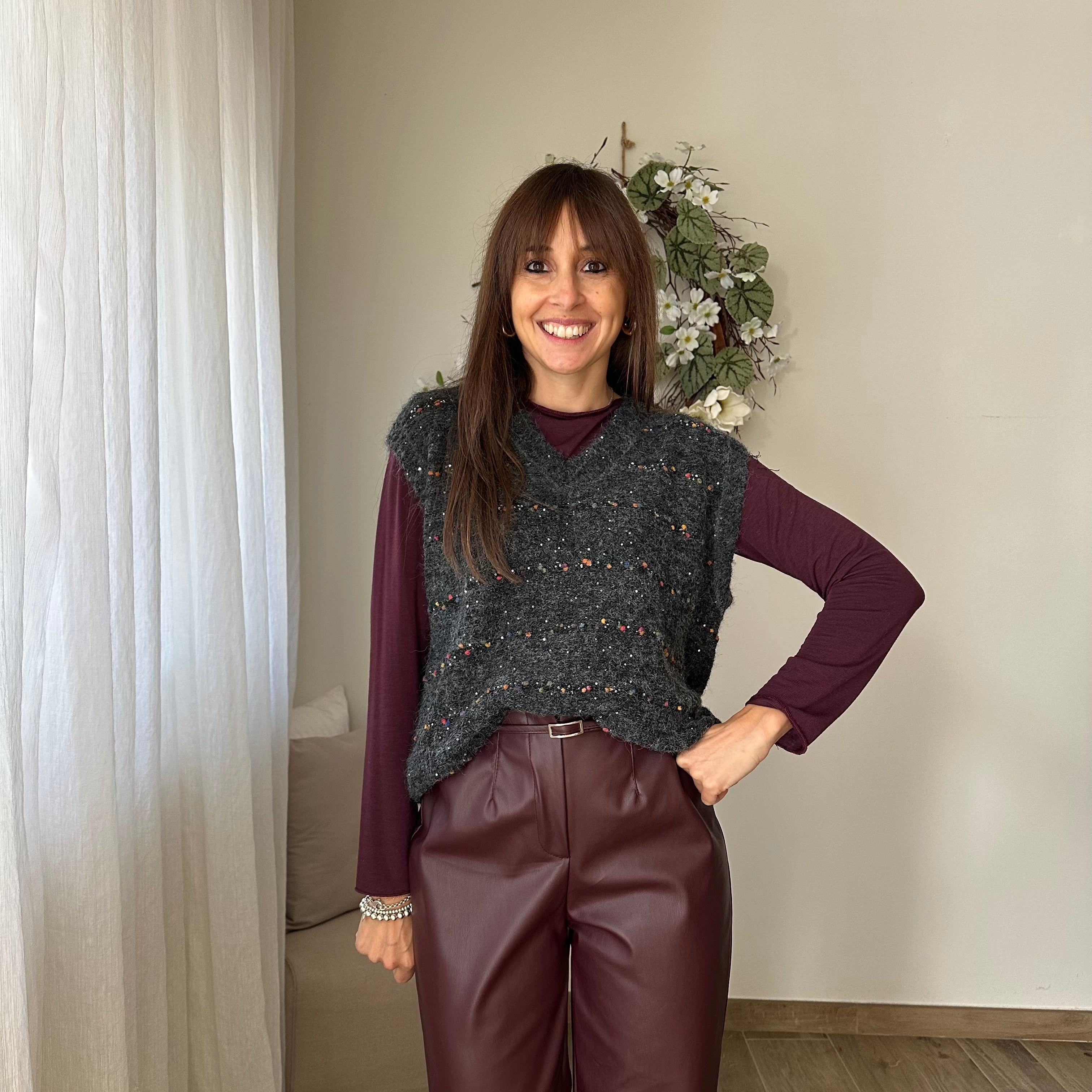 Gilet grigio con pallini colorati e micro paillettes, scollo a V