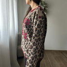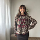 Maglione maculato con dettagli Bordeaux, bottoncini su una spalla e scritta sul davanti.