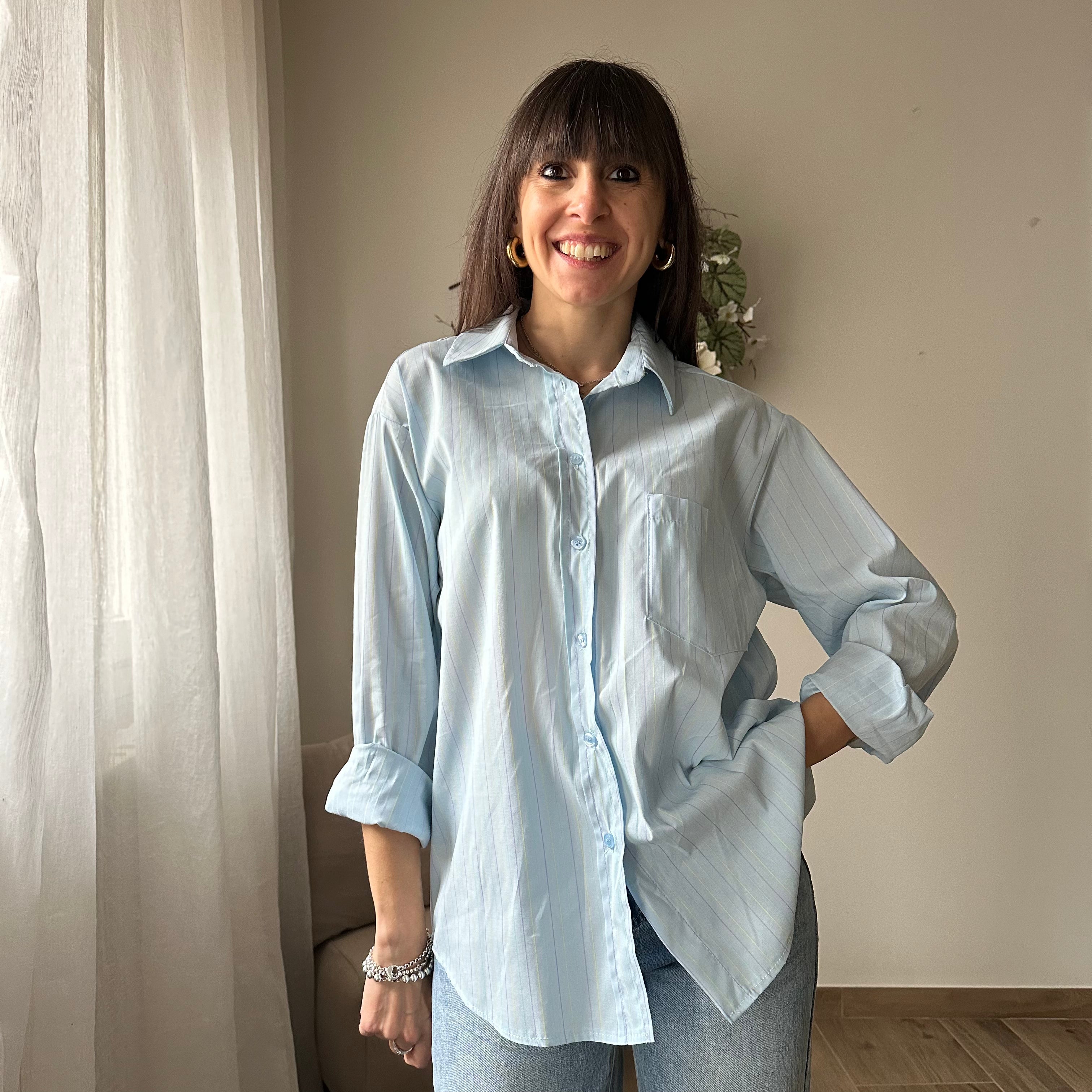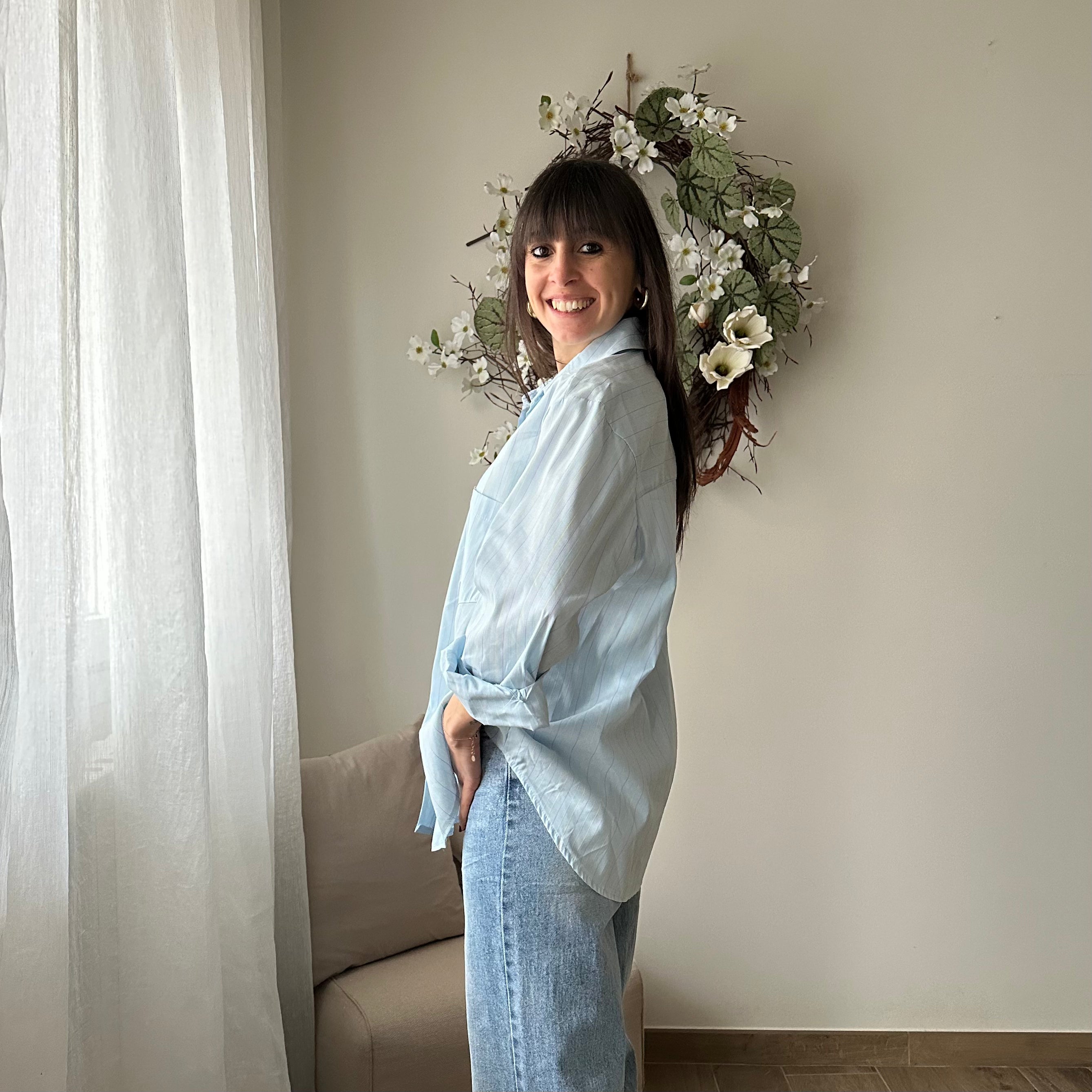 Camicia in cotone a righe colorate lilla rosa e gialla, chiusura con bottoni, taschino su un lato, lunghezza regolare