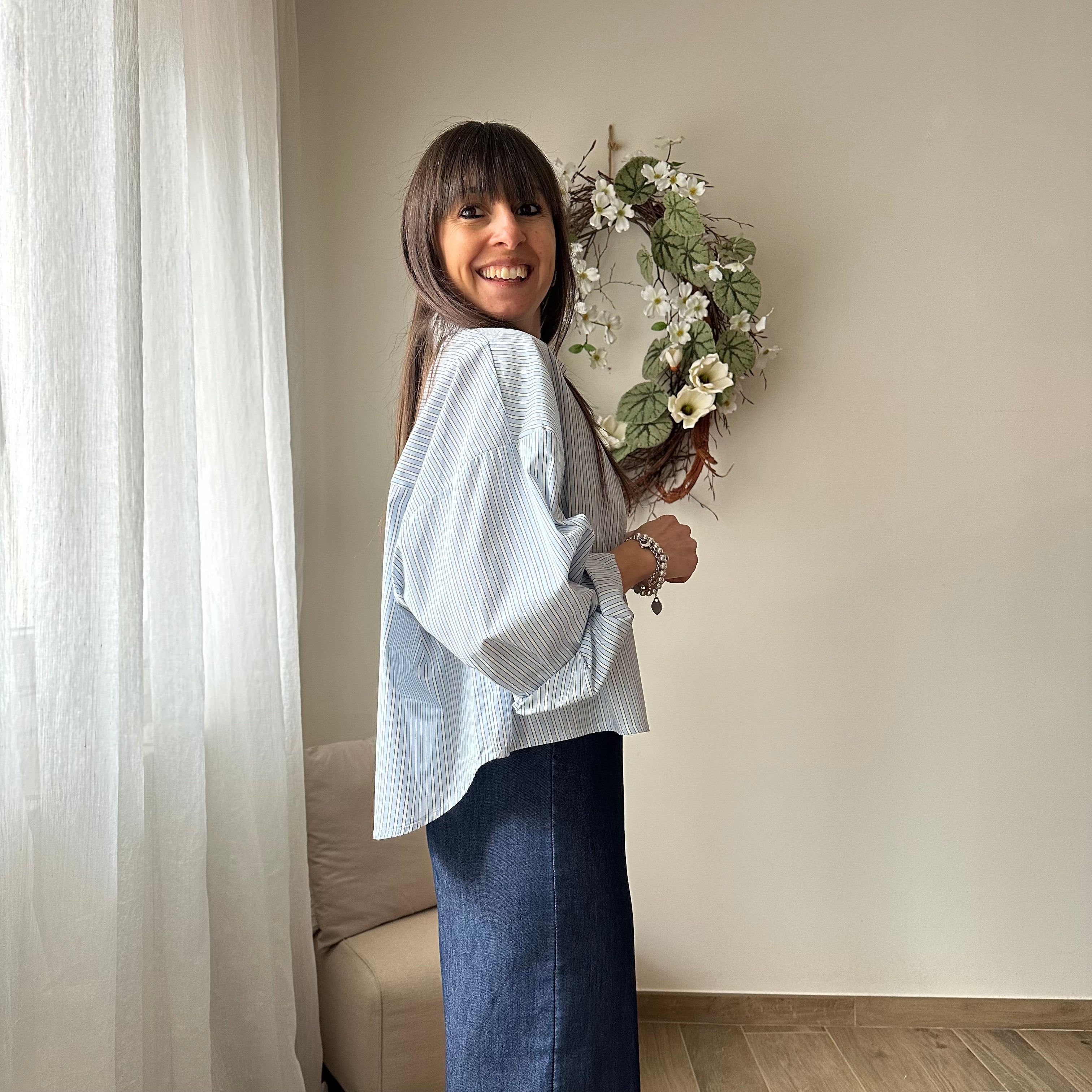 Camicia corta azzurra a righe bianche a blu, tasche sul davanti, manica lunga, giromanica ampio