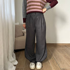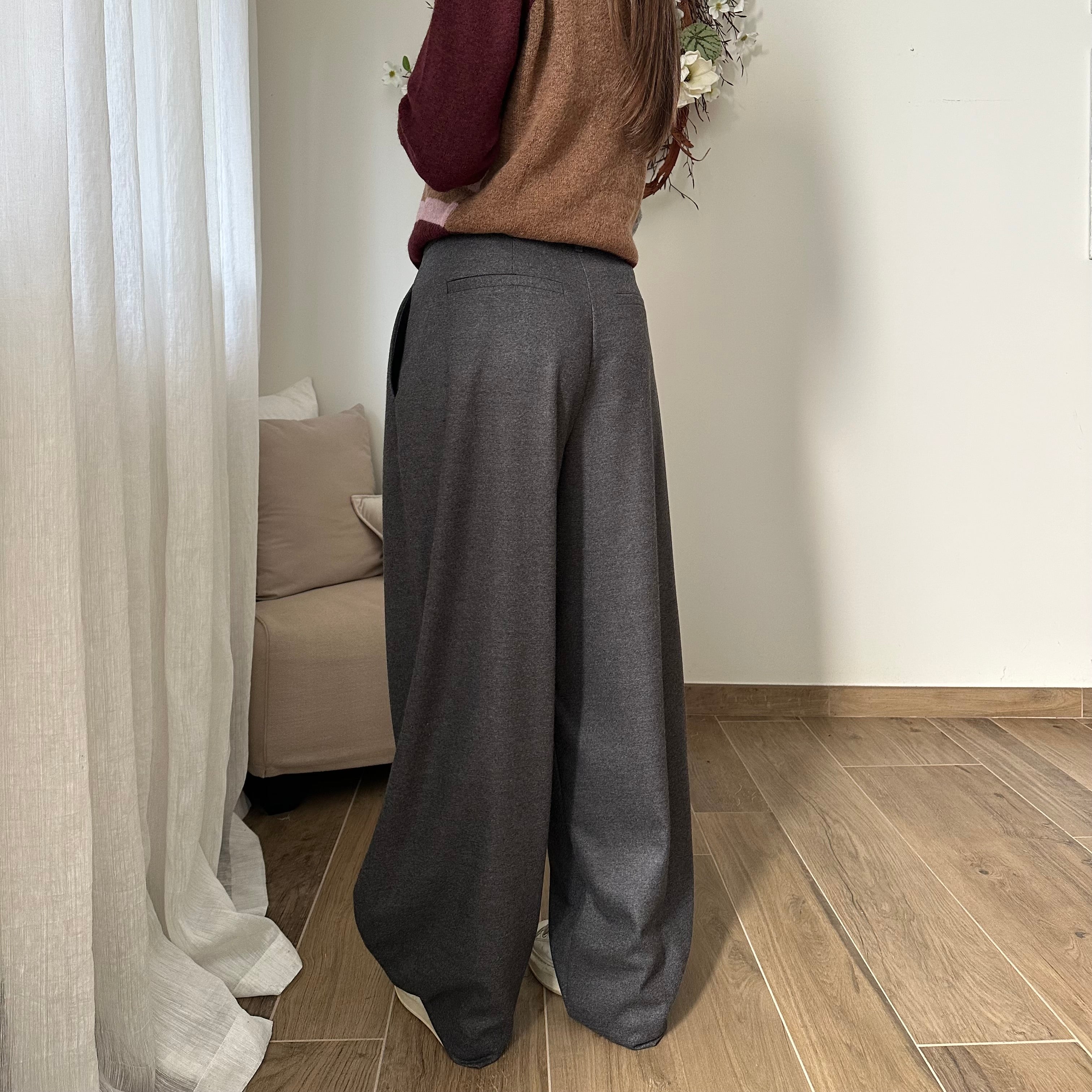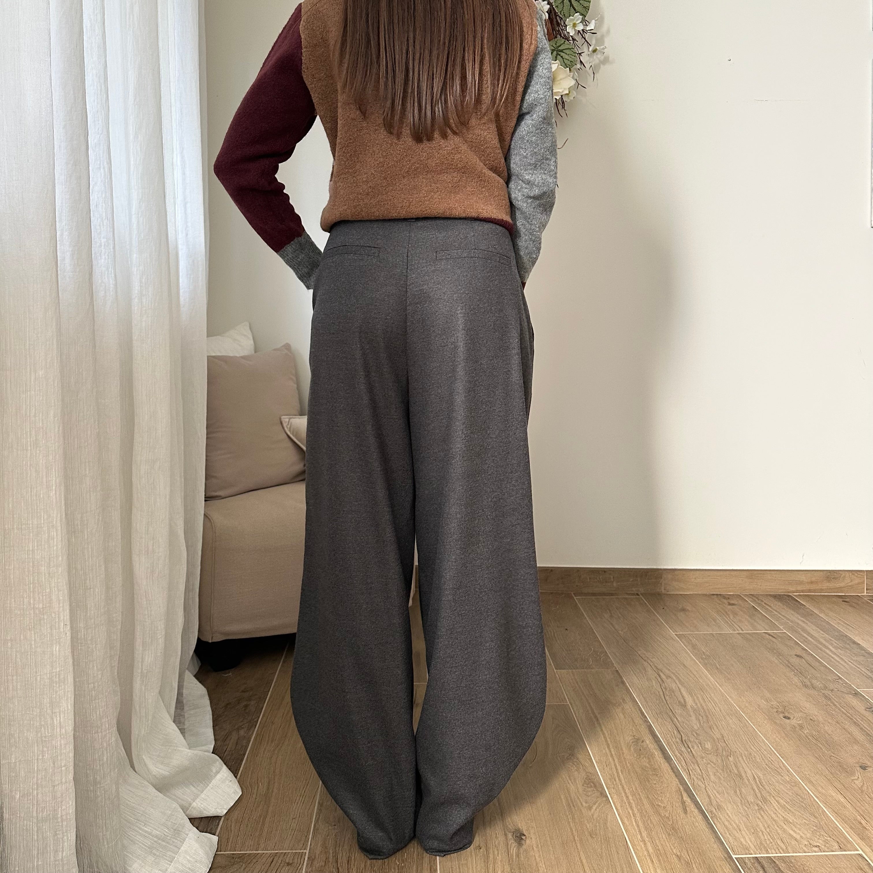 Pantalone tessuto morbido, pence sul davanti, scende a banana sulla caviglia. bottone di chiusura e tasche finte sul retro.